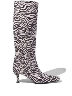 Noir/blanc, cuir de veau, imprimé zèbre, bout carré, talon mi-haut, hauteur genou.
