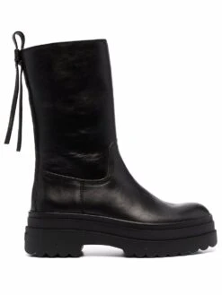 DĂ©tail de nĹ“ud, dĂ©tail de logo embossĂ©, bout en amande, fermeture zippĂ©e sur le cĂ´tĂ©, languette d’enfilage Ă logo au talon, longueur midi, semelle Ă©paisse en caoutchouc. Couleur : noir. Matière : cuir.
