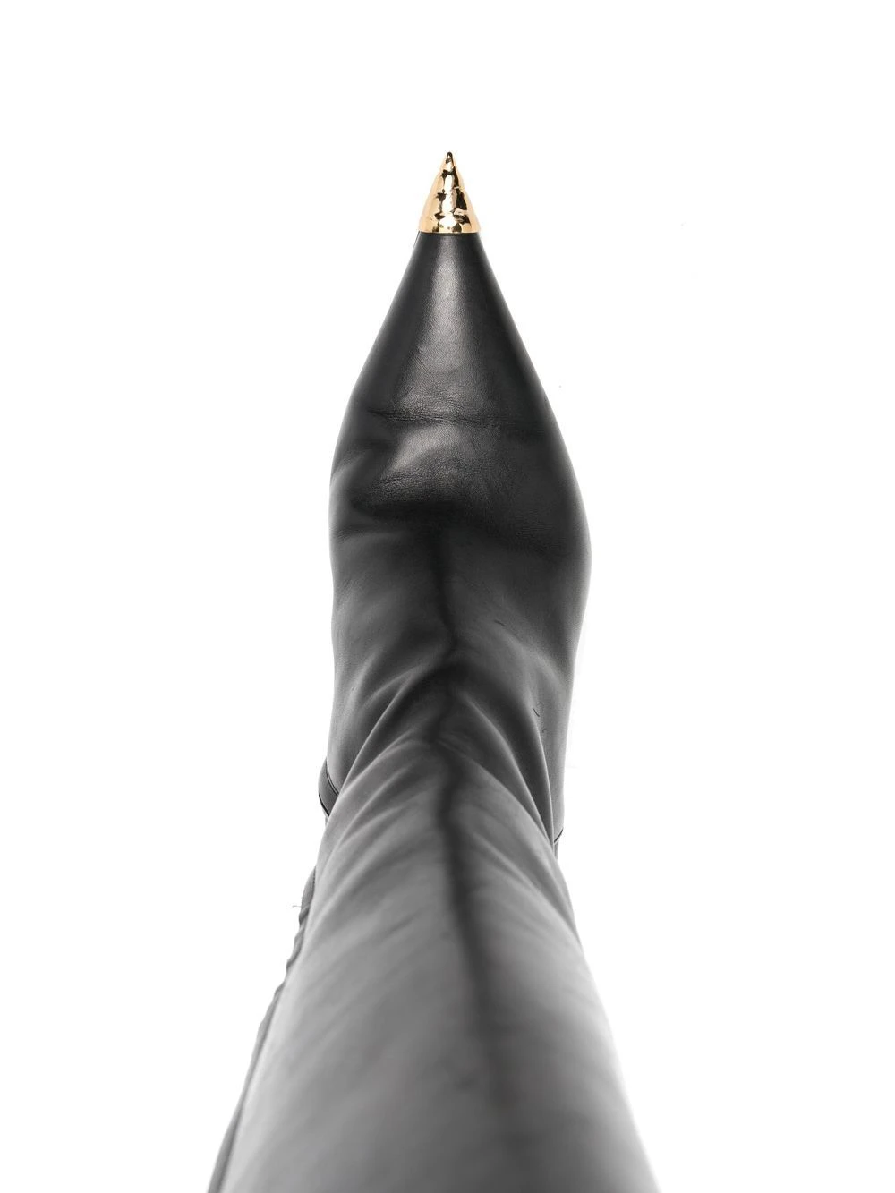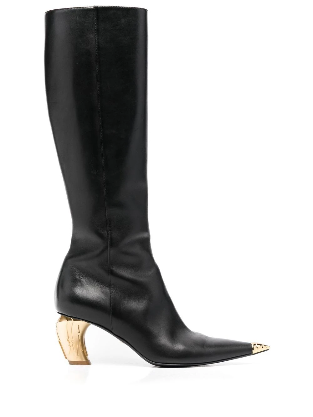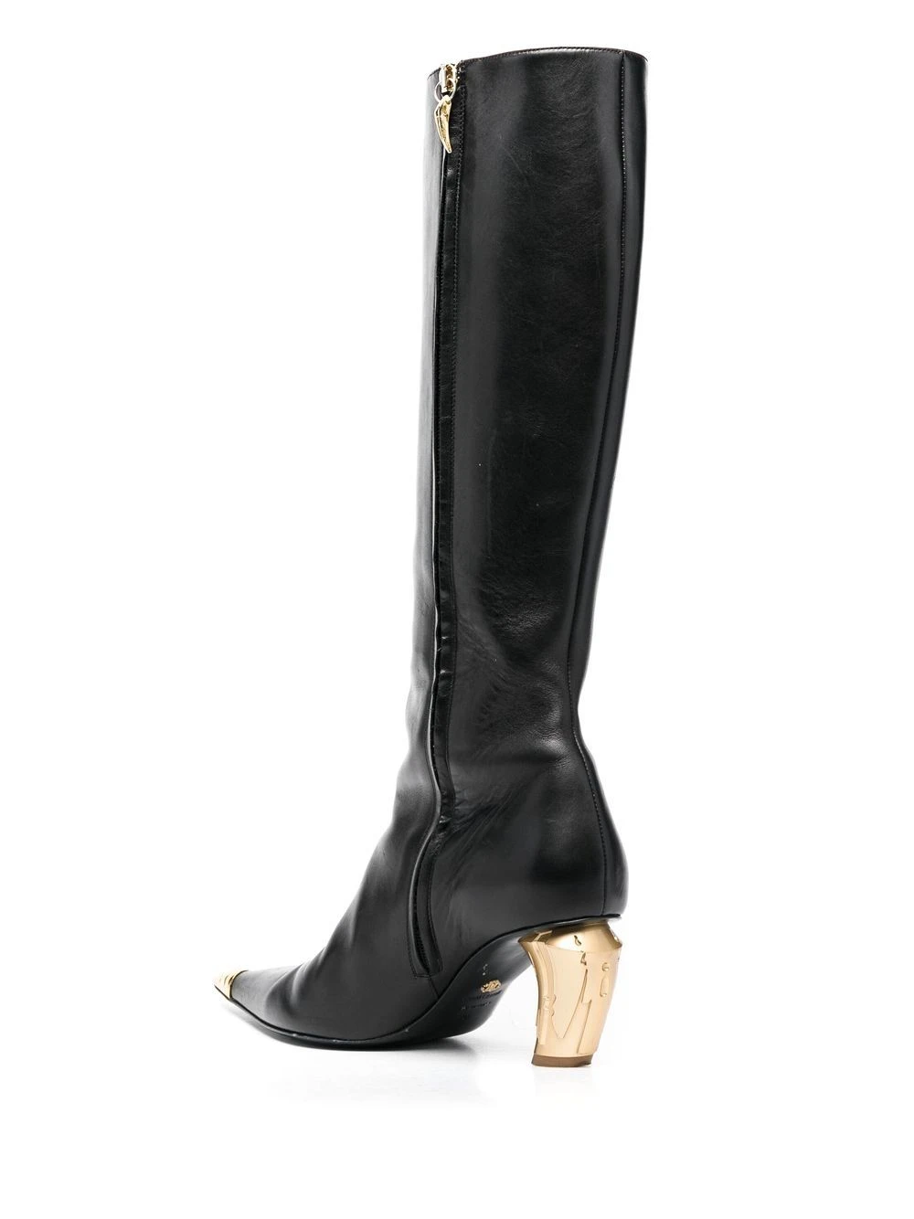 Noir, cuir, bout pointu, fermeture zippée sur le côté, semelle intérieure à logo, talon mi-haut.