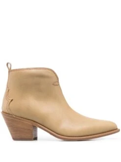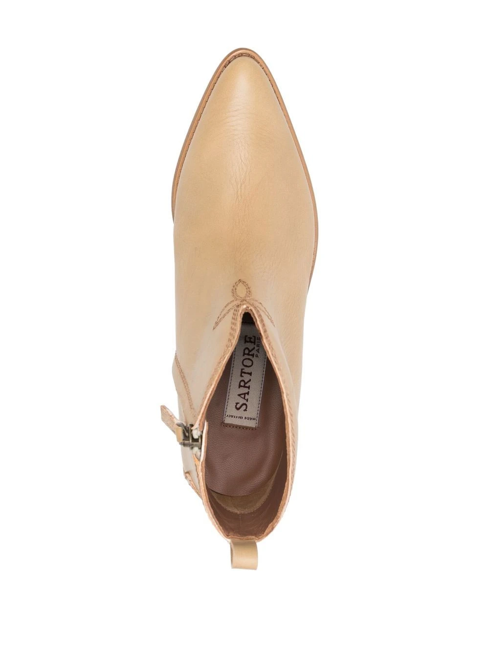Beige, cuir, doublure en cuir, bout pointu, design à enfiler, talon mi-haut épais.