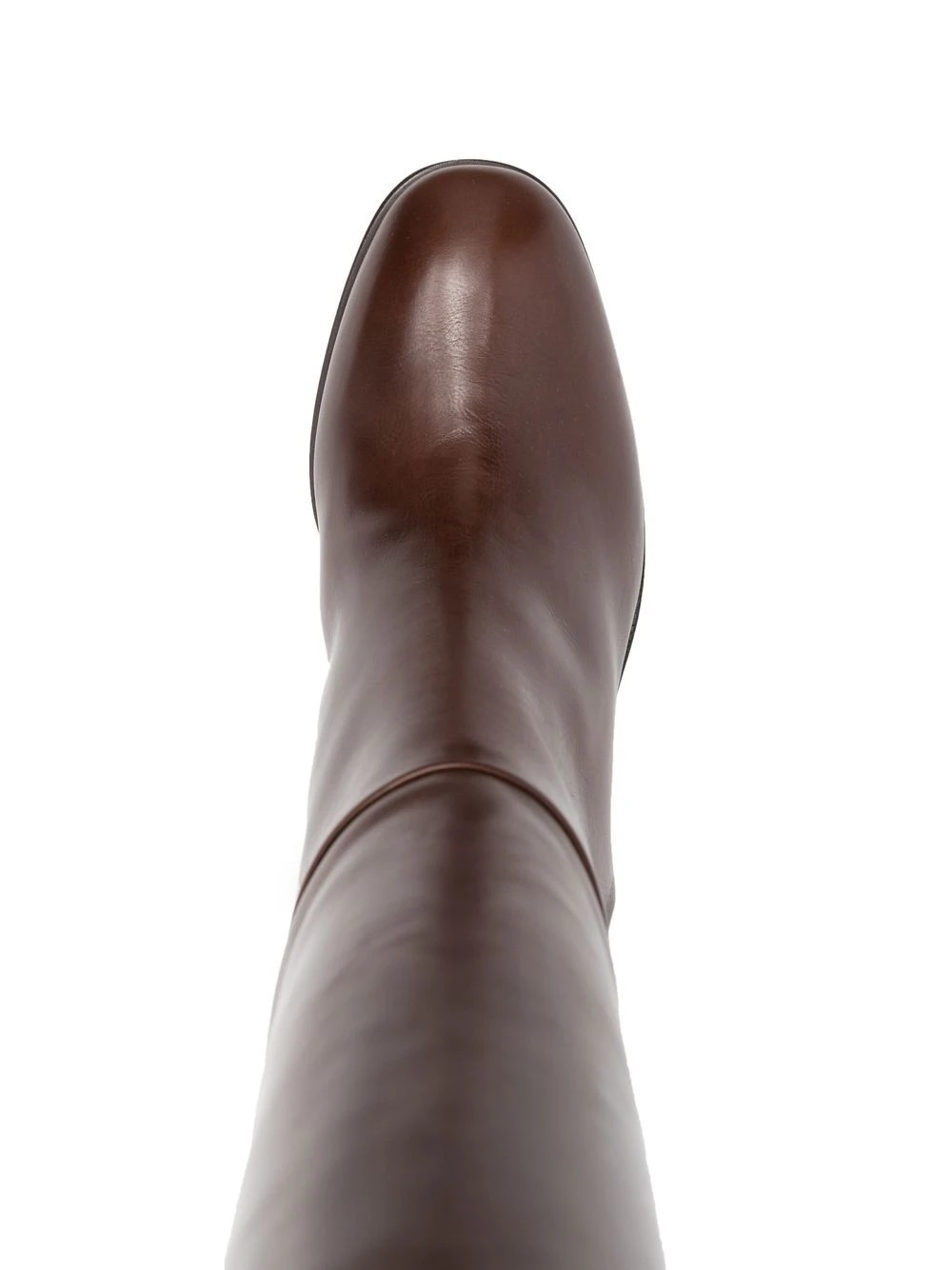 Marron, cuir de veau, hauteur genou, bout rond, semelle intérieure griffée, à enfiler.