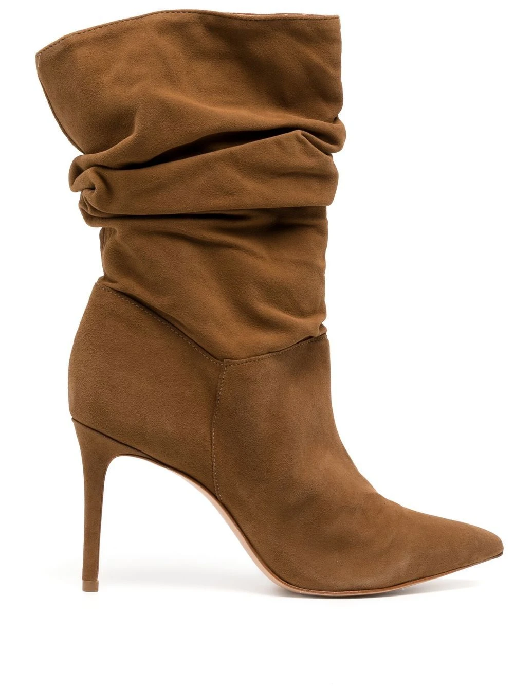 Noisette, cuir de veau, finitions en daim, design souple, bout pointu, talon aiguille haut, longueur midi, à enfiler.
