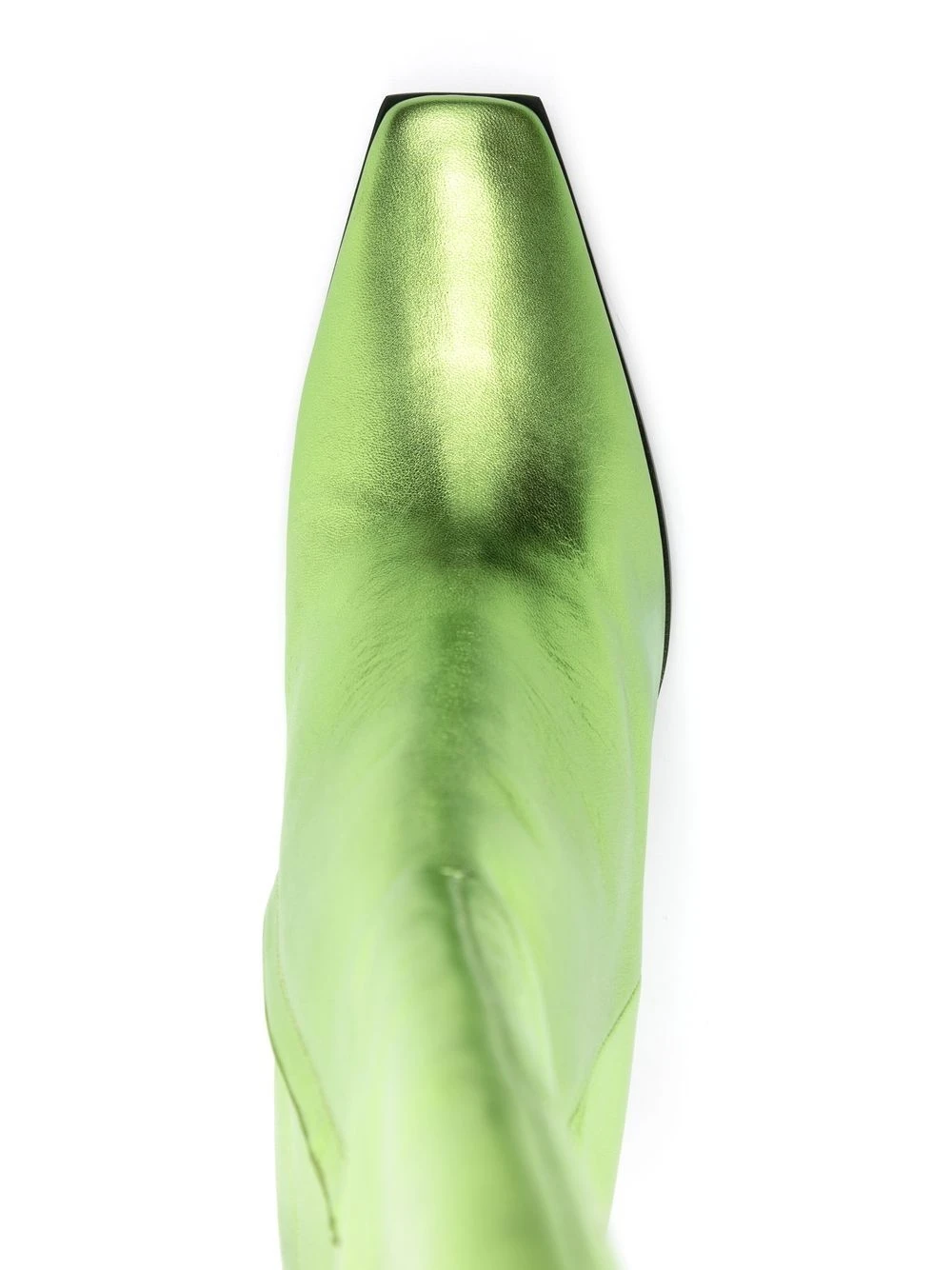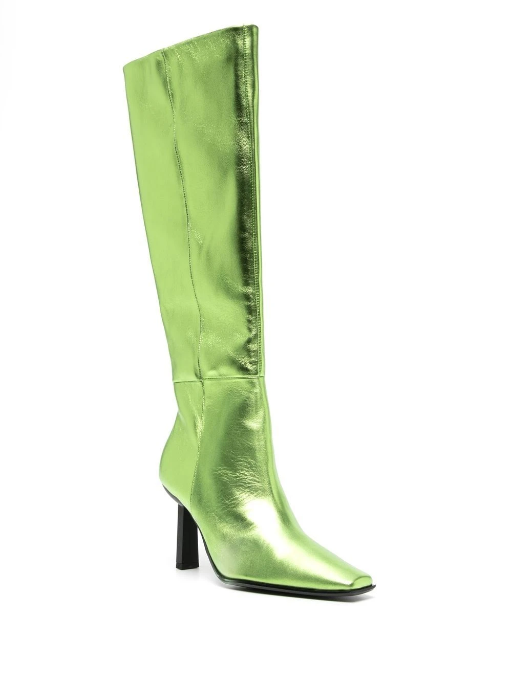 Vert vif, cuir de veau, effet métallisé, bout pointu, talon mi-haut, à enfiler.