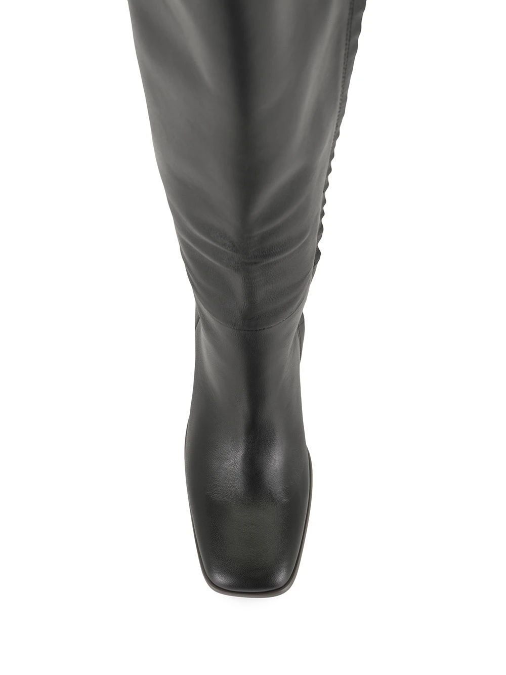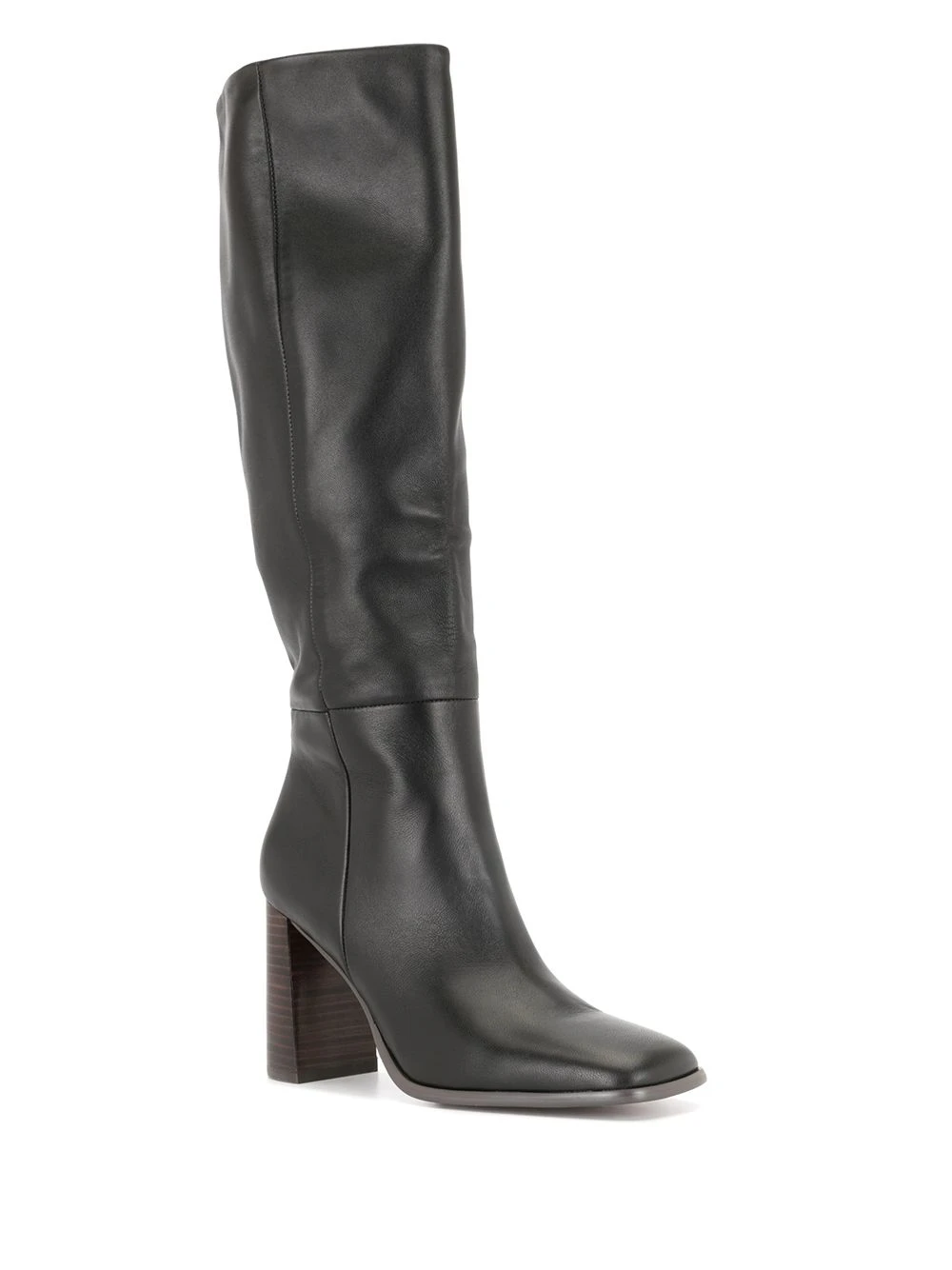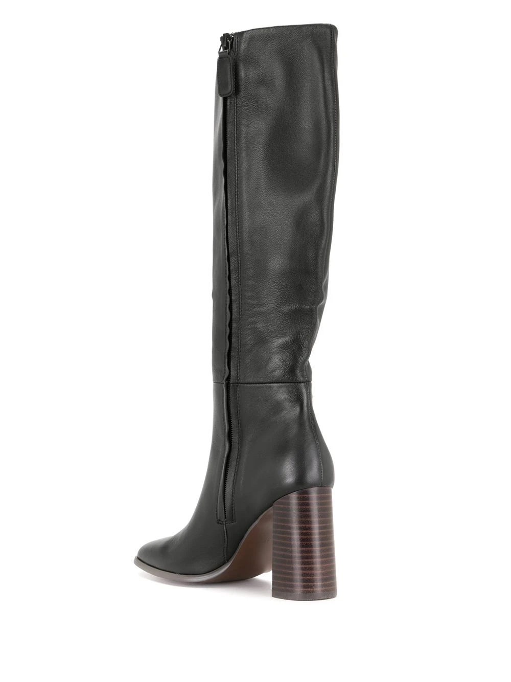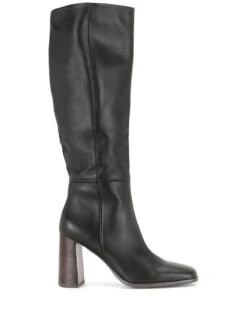 Hauteur genou, bout carré, fermeture zippée sur le côté, talon haut épais. Couleur : noir.