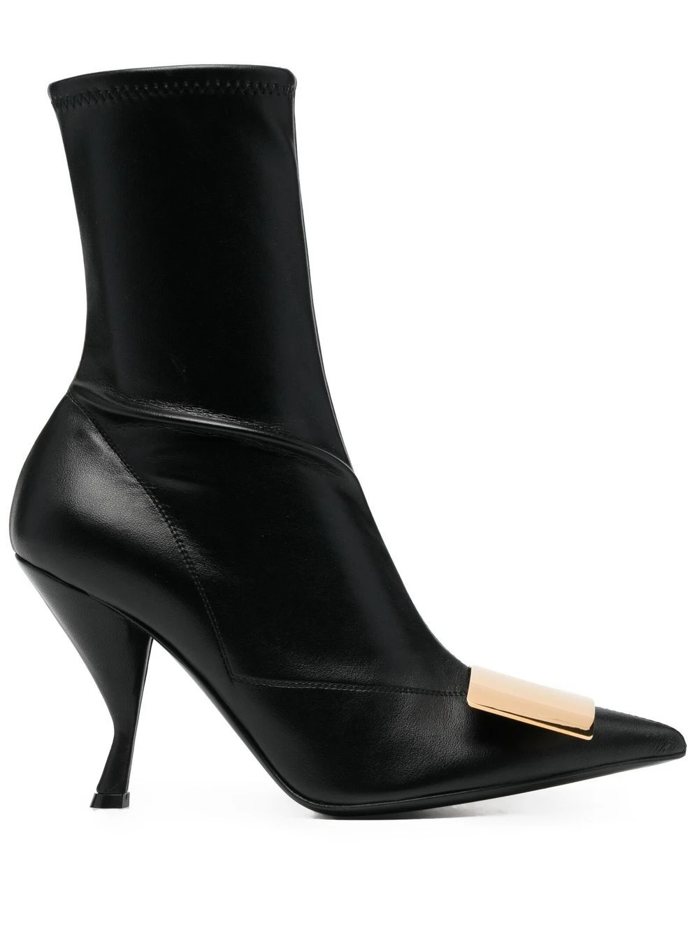 Noir, cuir de veau, finitions en métal doré, bout pointu, talon aiguille.