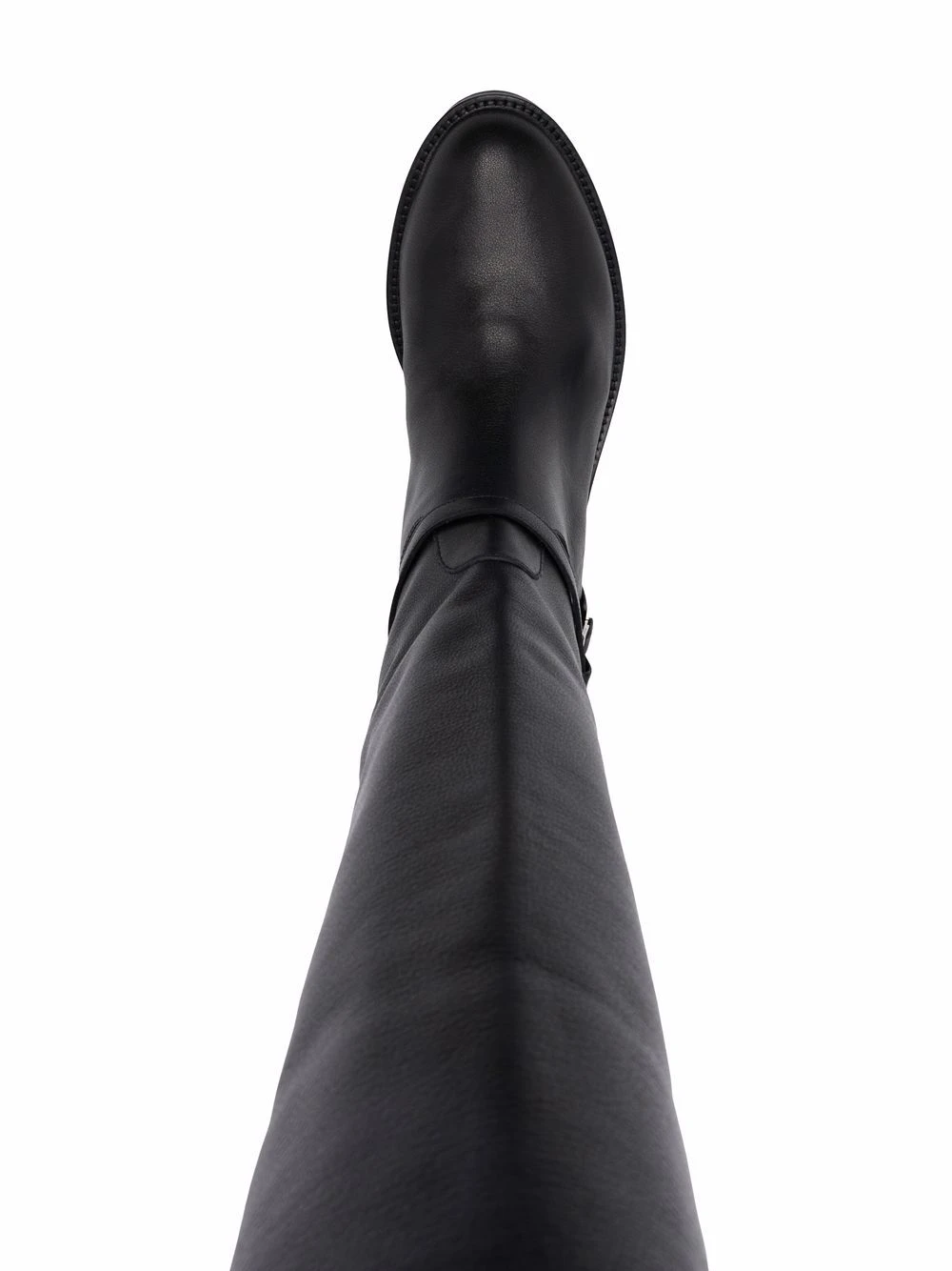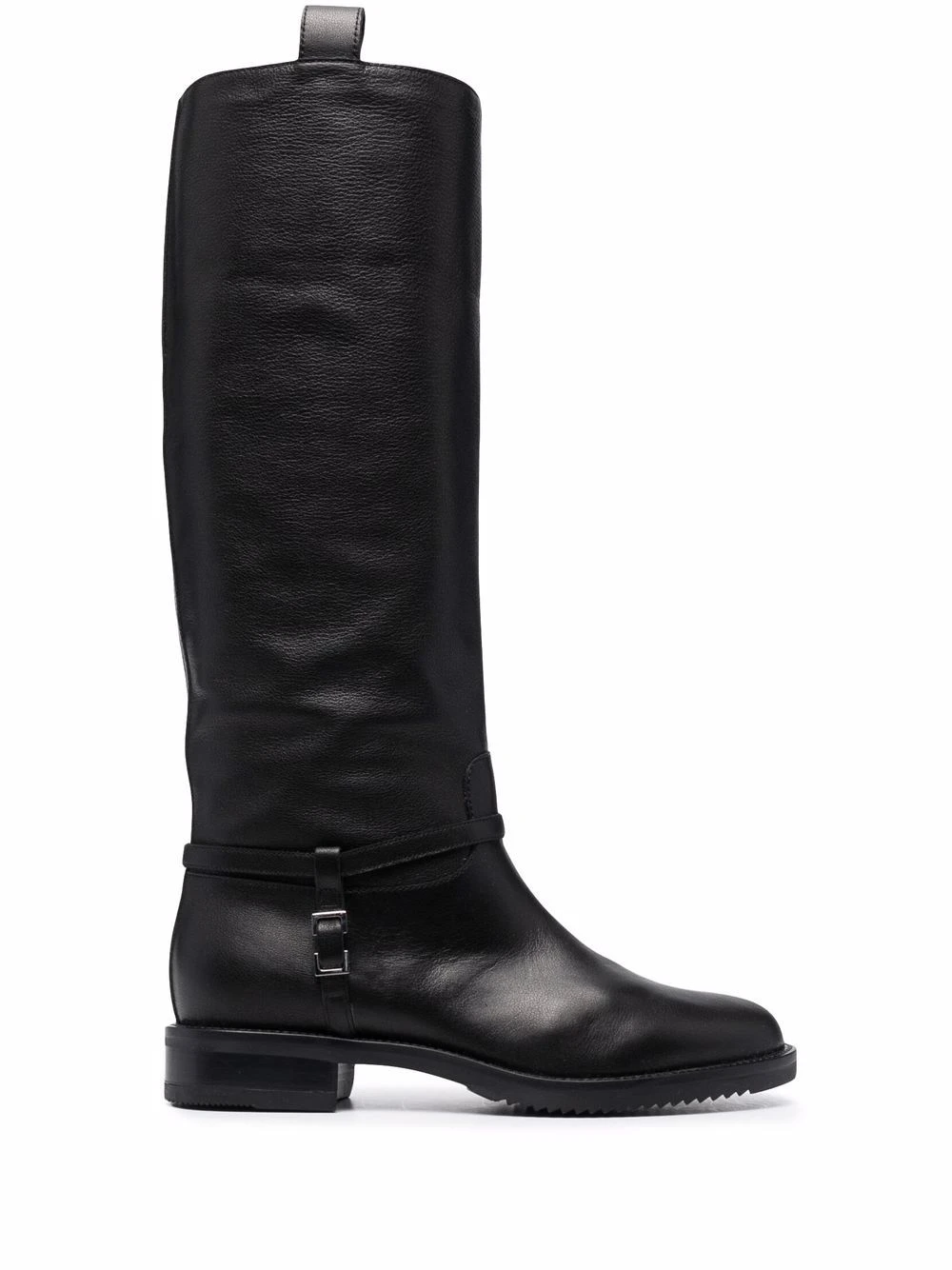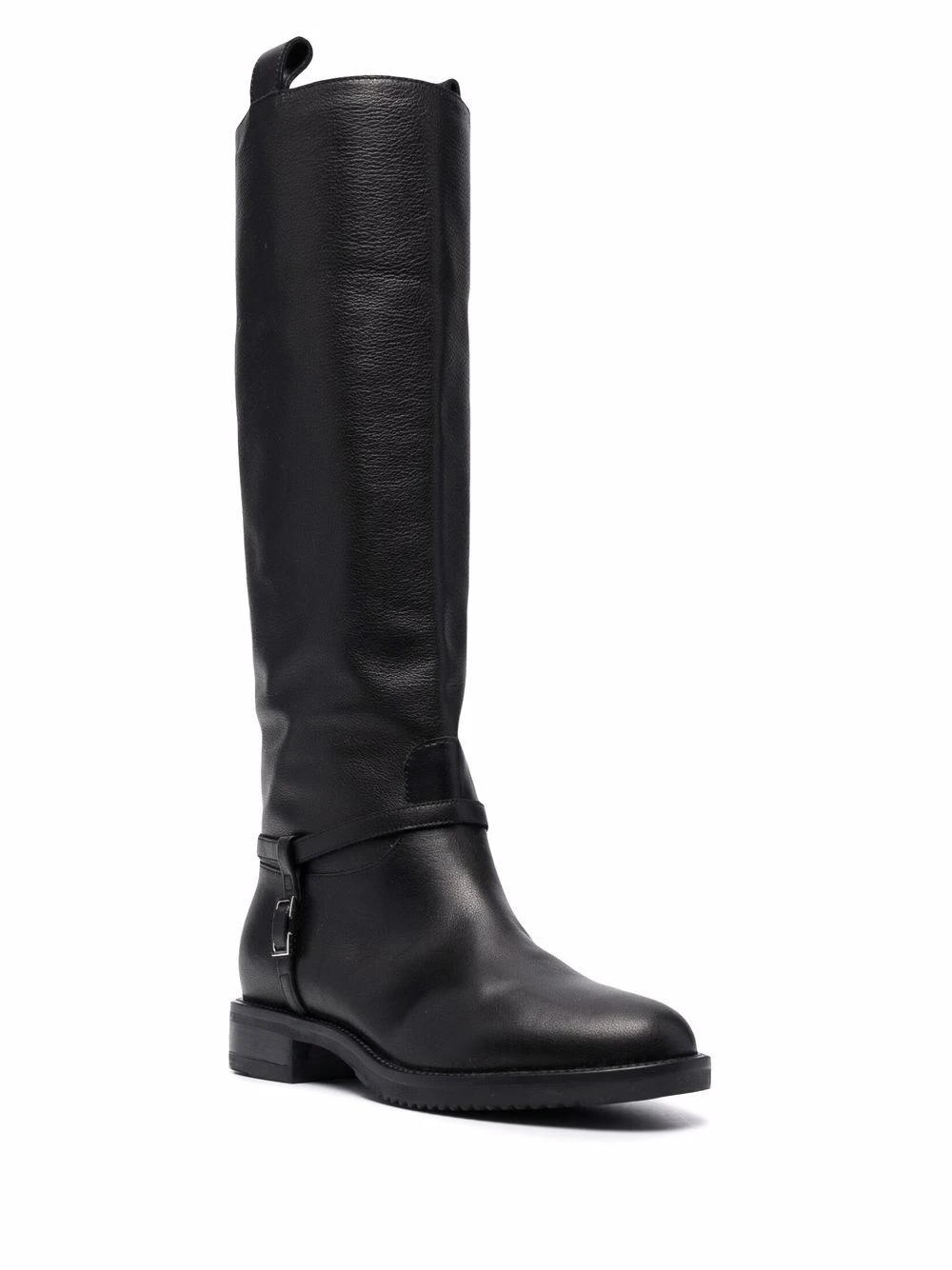 Bout rond, détail de boucle décorative, hauteur genou, ouverture à double languette. Couleur : noir. Matière : cuir.