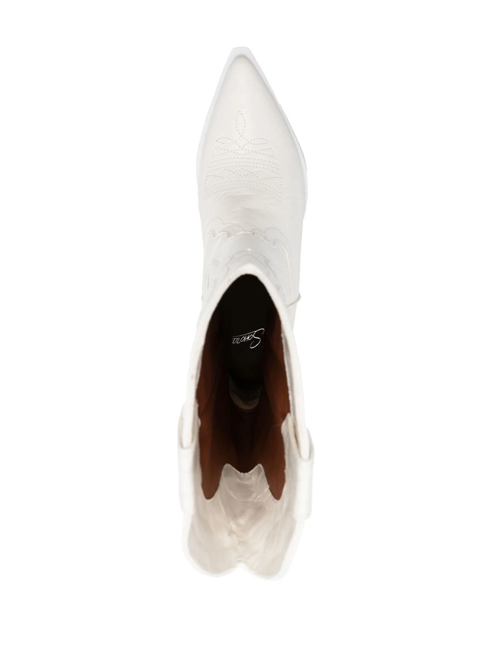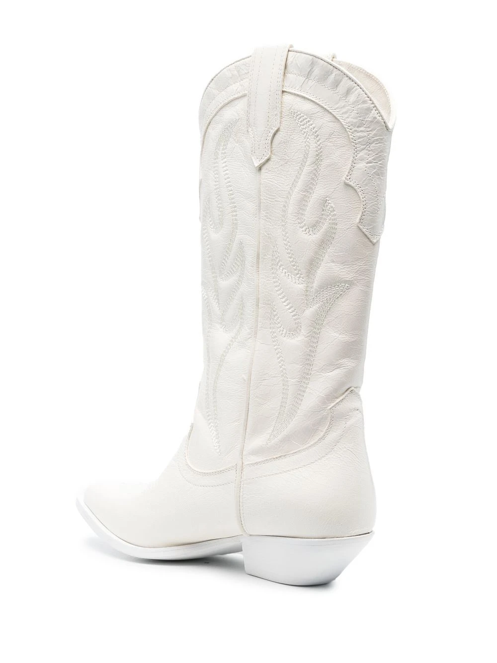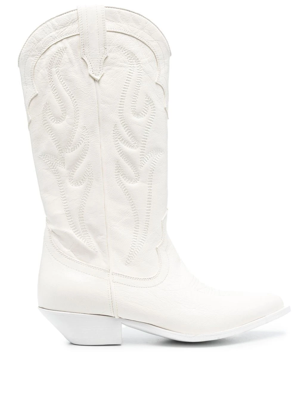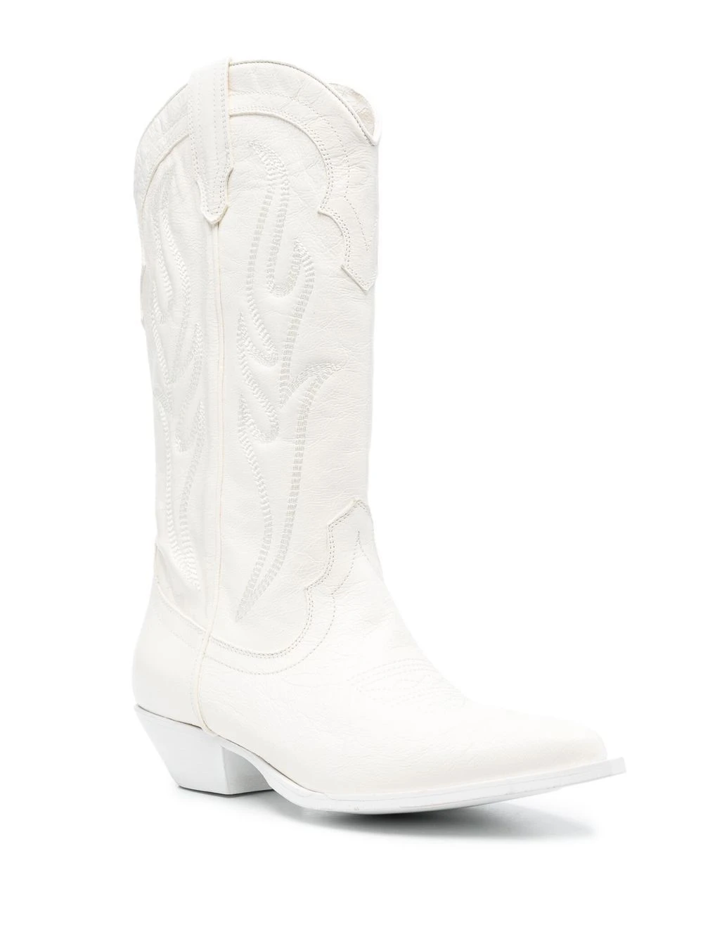 Cuir de veau, bout en amande, talon mi-haut, modèle d’inspiration Western, design à enfiler.