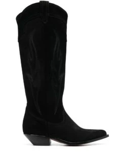 Noir, veau velours, cuir de veau, modèle d’inspiration Western, imprimé flamme, coutures ton sur ton, hauteur genou, bout pointu, ouverture à double languette, semelle intérieure griffée, à enfiler.
