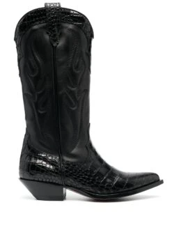 Noir, cuir de veau, effet peau de crocodile, bout pointu, design à enfiler, hauteur genou, semelle en caoutchouc, talon mi-haut.