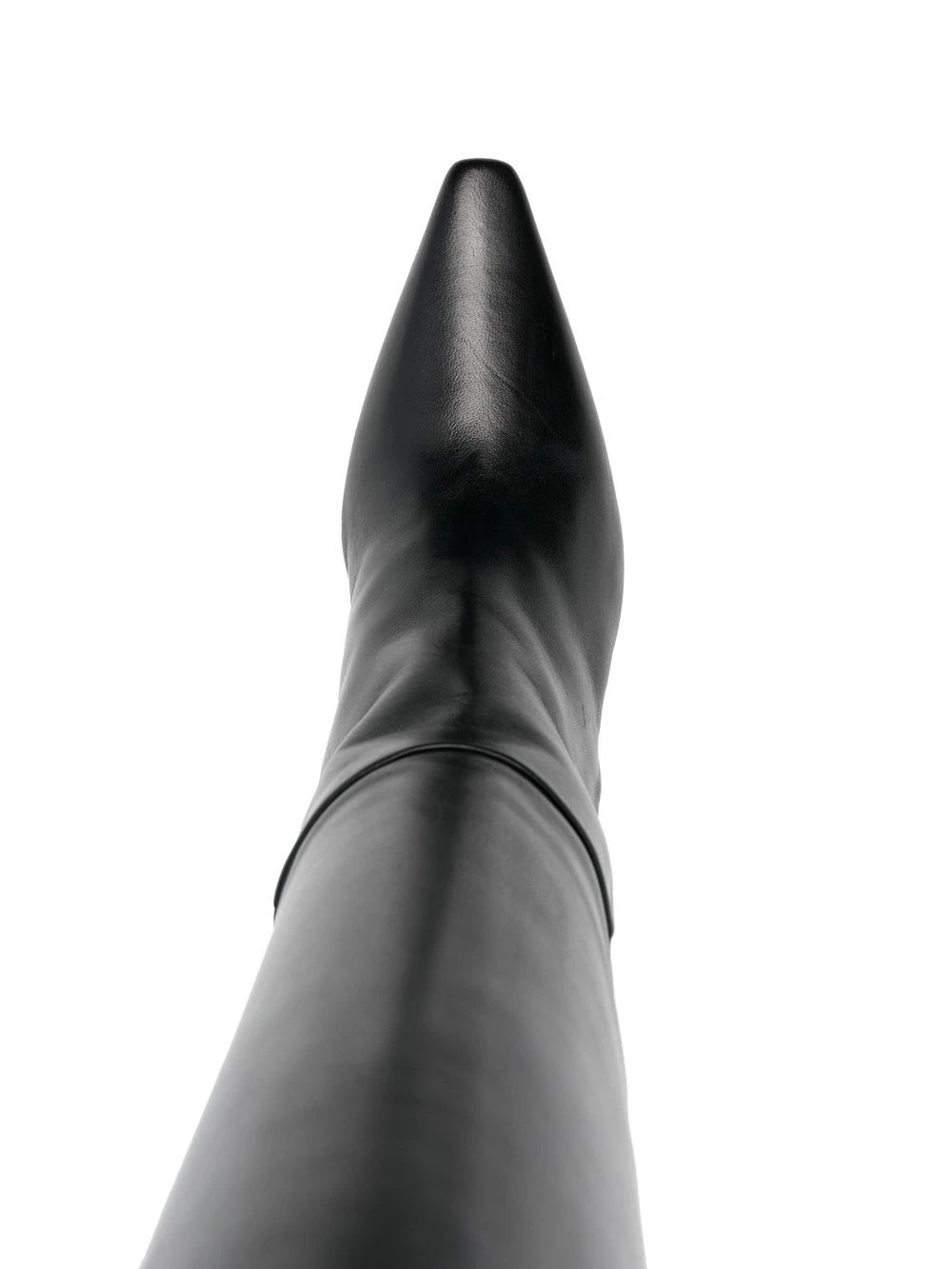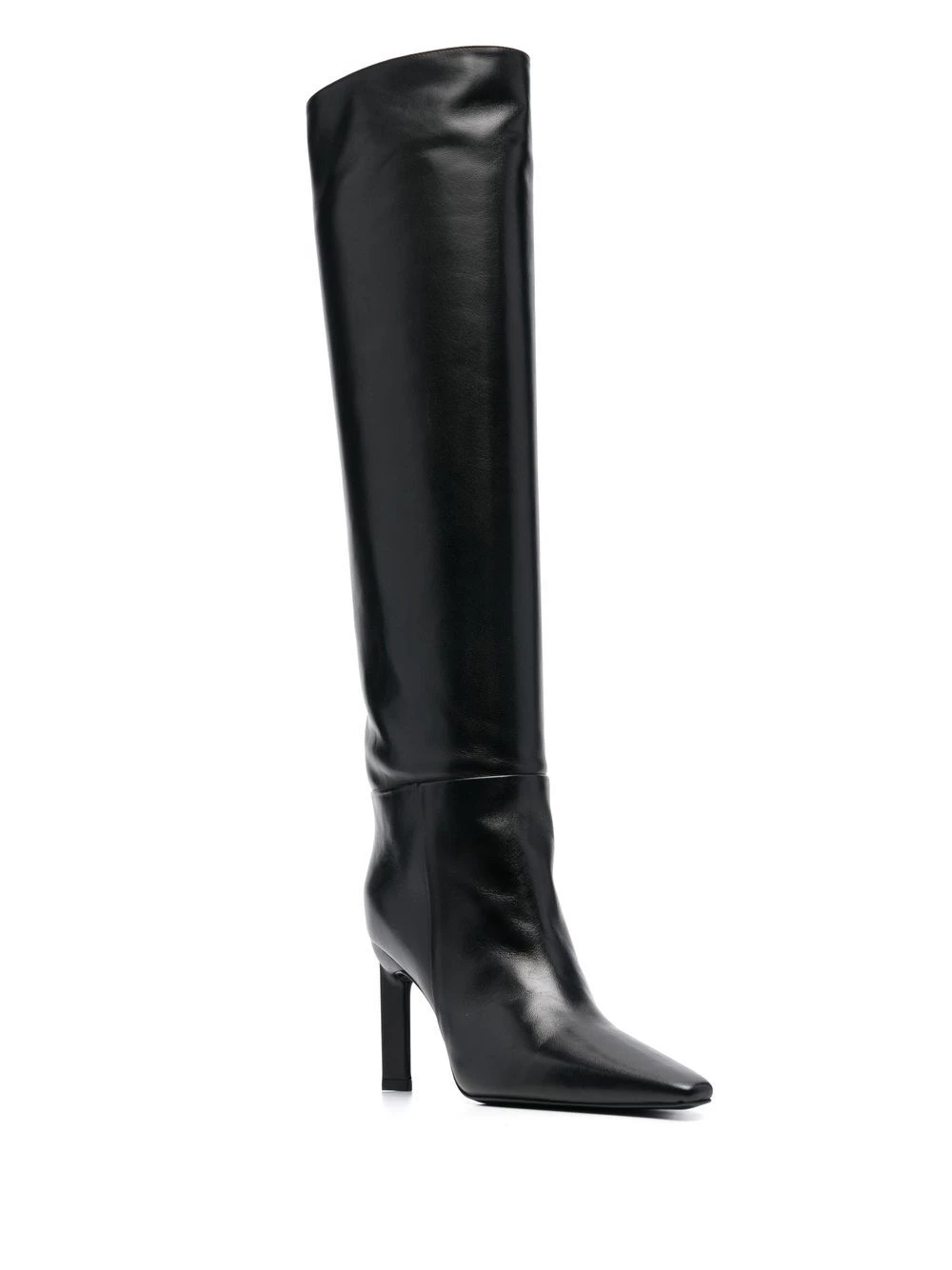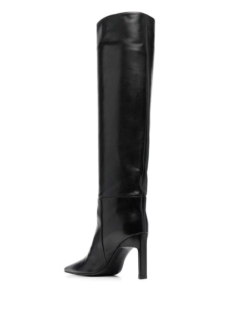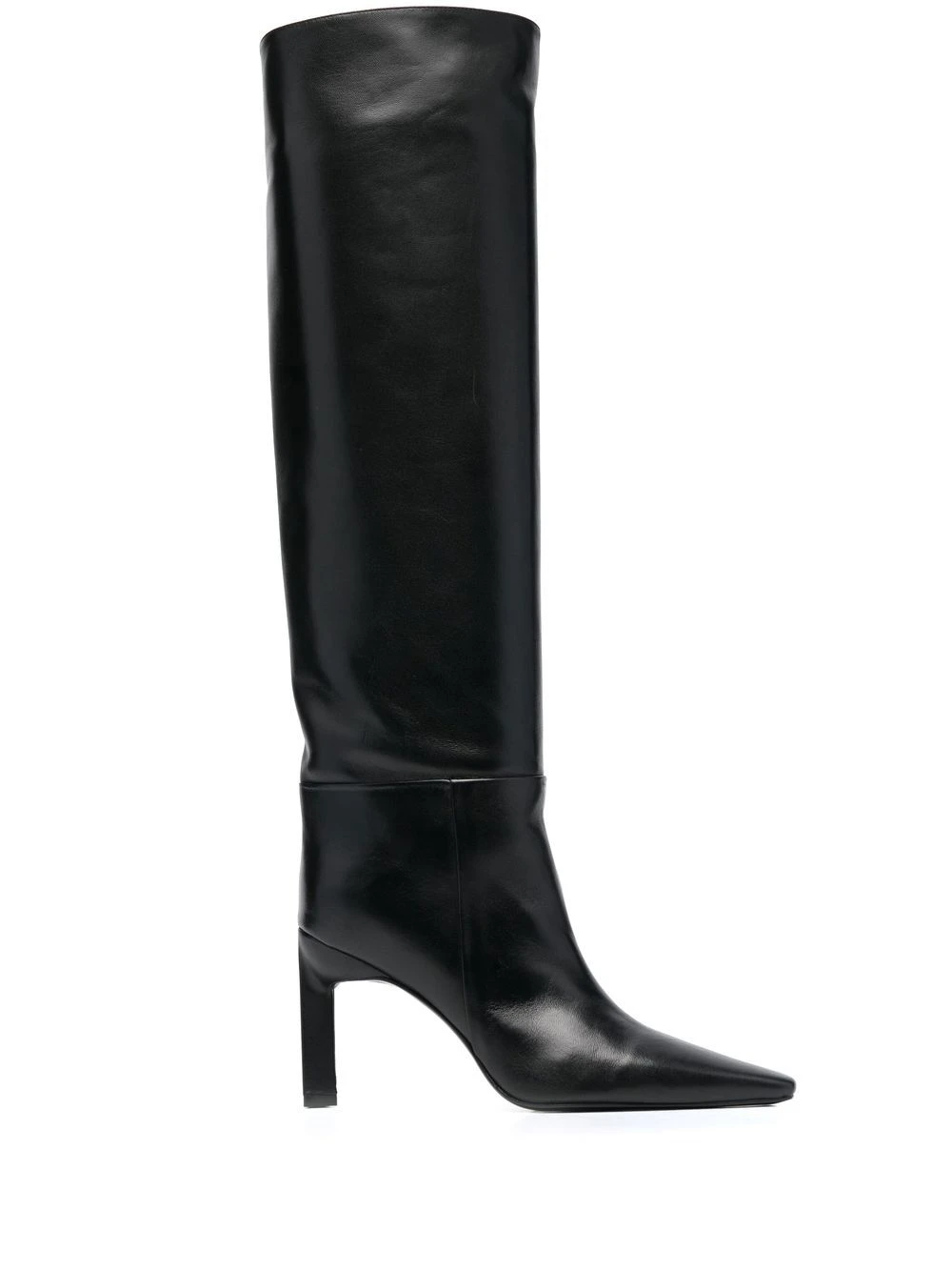 Noir, cuir, bout carré, design à enfiler, hauteur genou, talon haut.