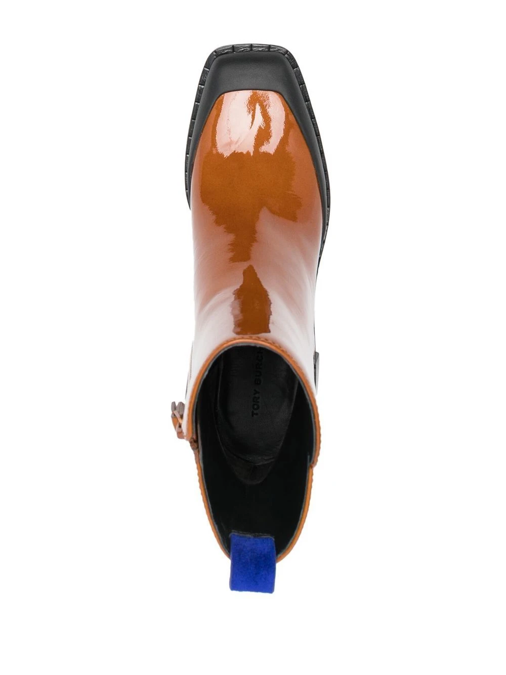 Auburn, cuir, fini verni, design colour block, semelle contrastante en caoutchouc, fermeture zippée sur le côté.