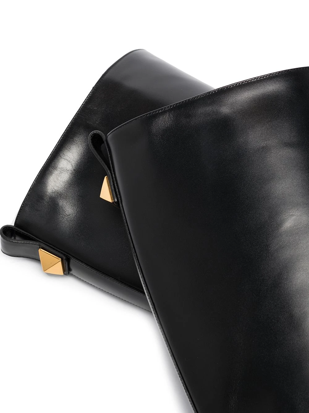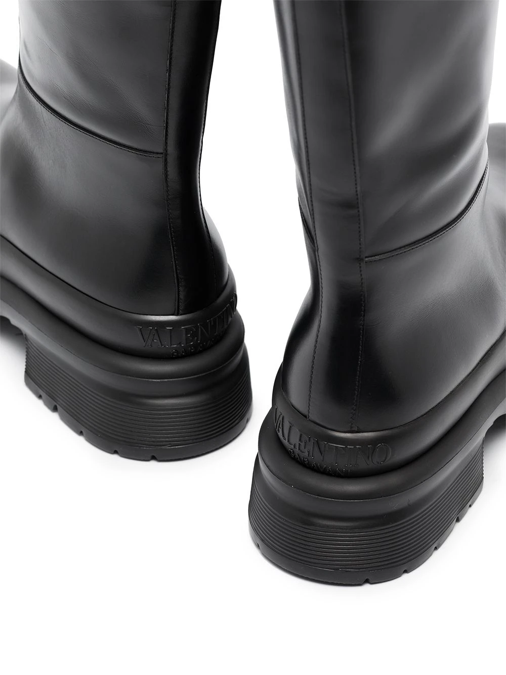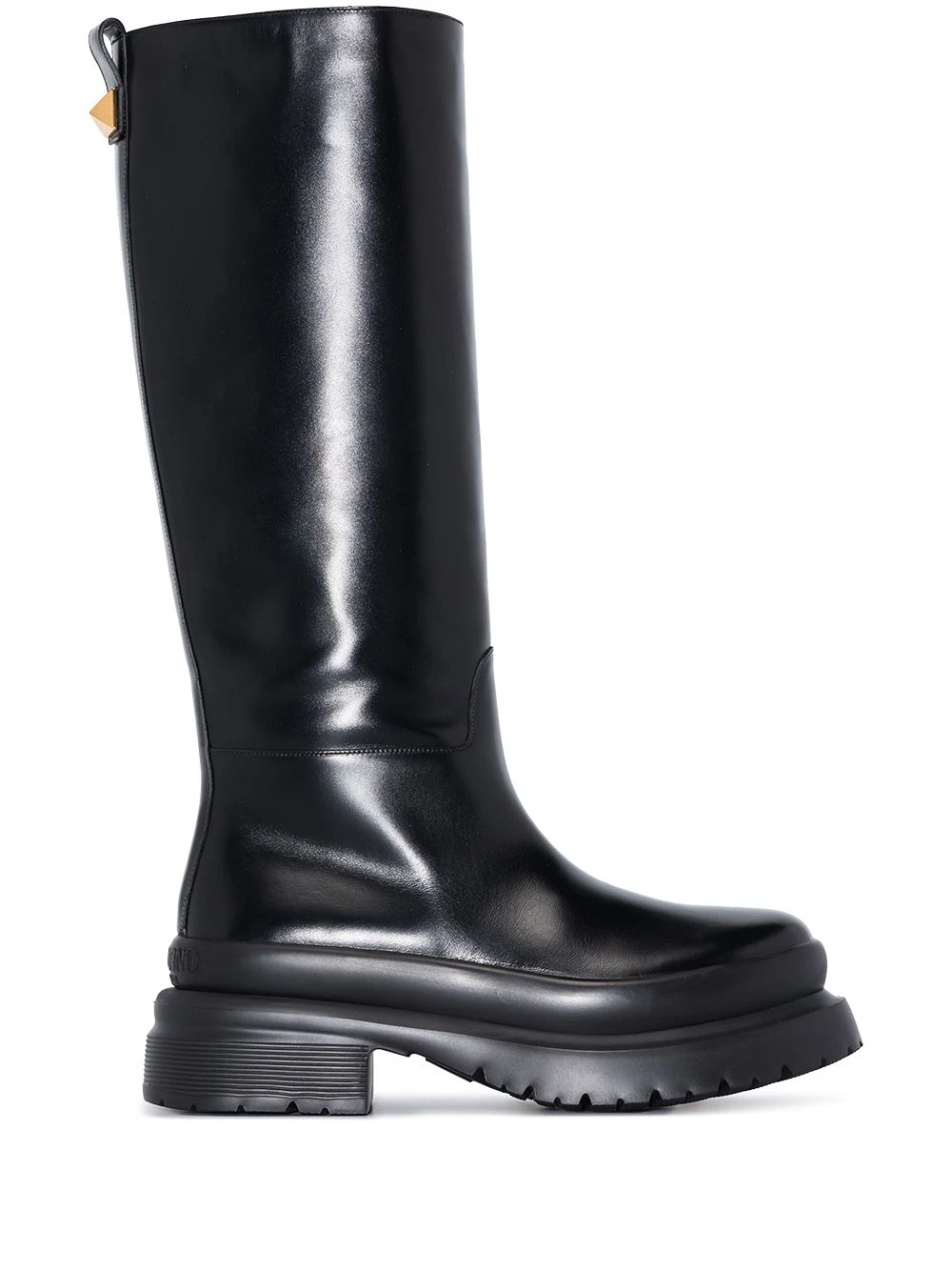 Finitions Roman Stud signature, languette d’enfilage au talon, bout rond, à enfiler, hauteur genou, semelle crantée en caoutchouc. Couleur : noir. Matière : cuir.