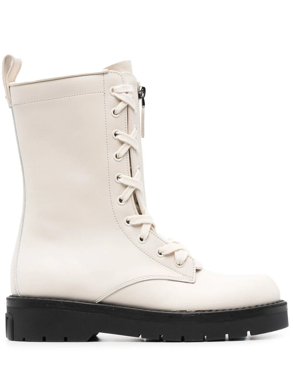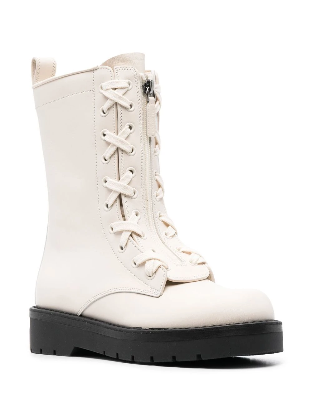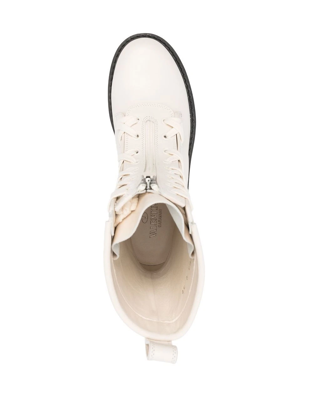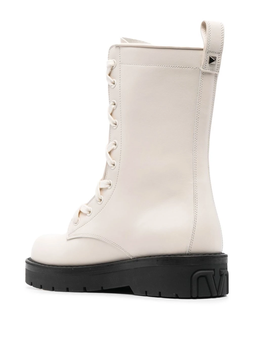 Blanc ivoire, cuir, bout rond, fermeture à lacer sur le devant, fermeture zippée devant, languette d’enfilage au talon, semelle crantée en caoutchouc, détails de clous Rockstud signature.
