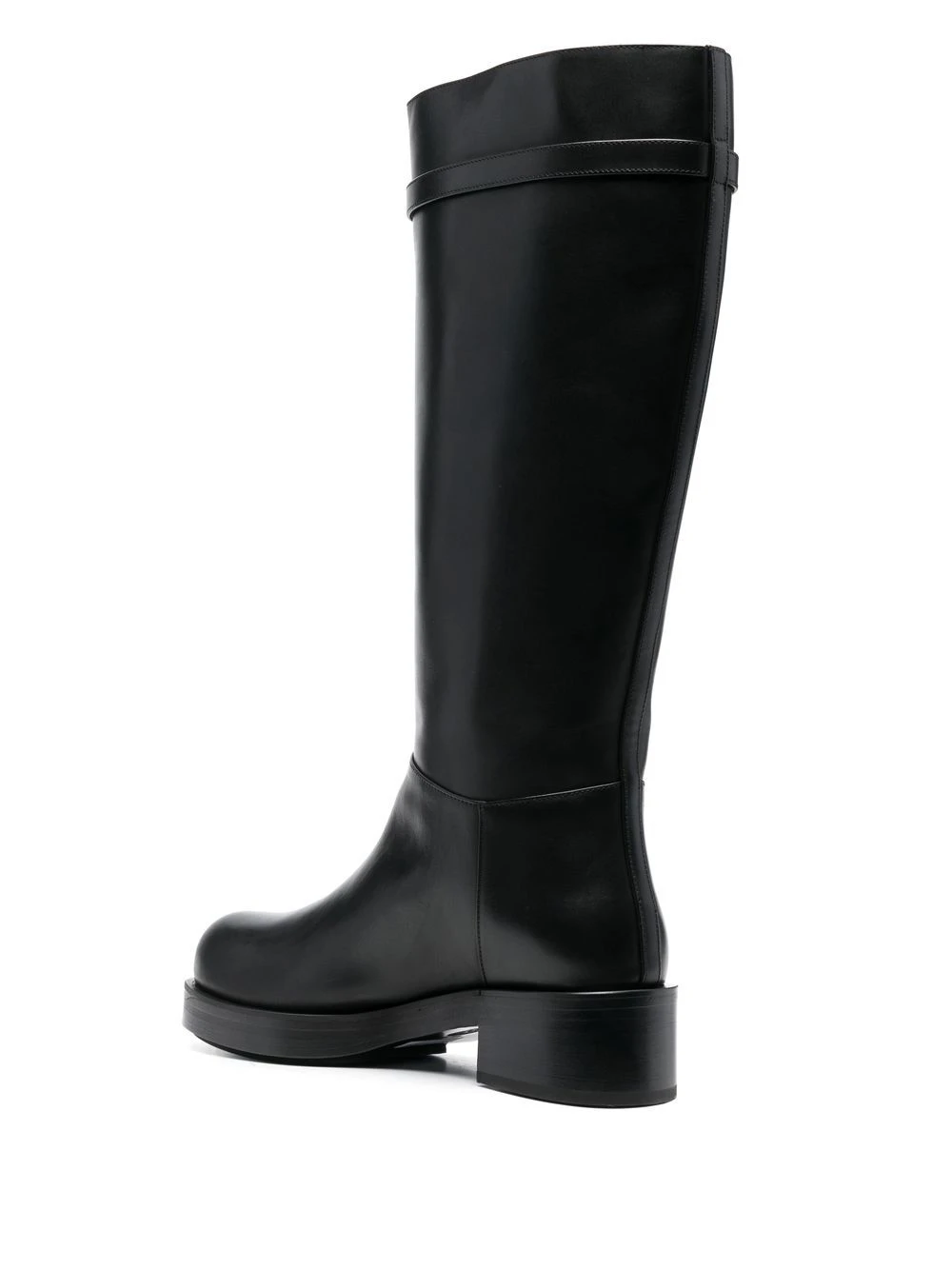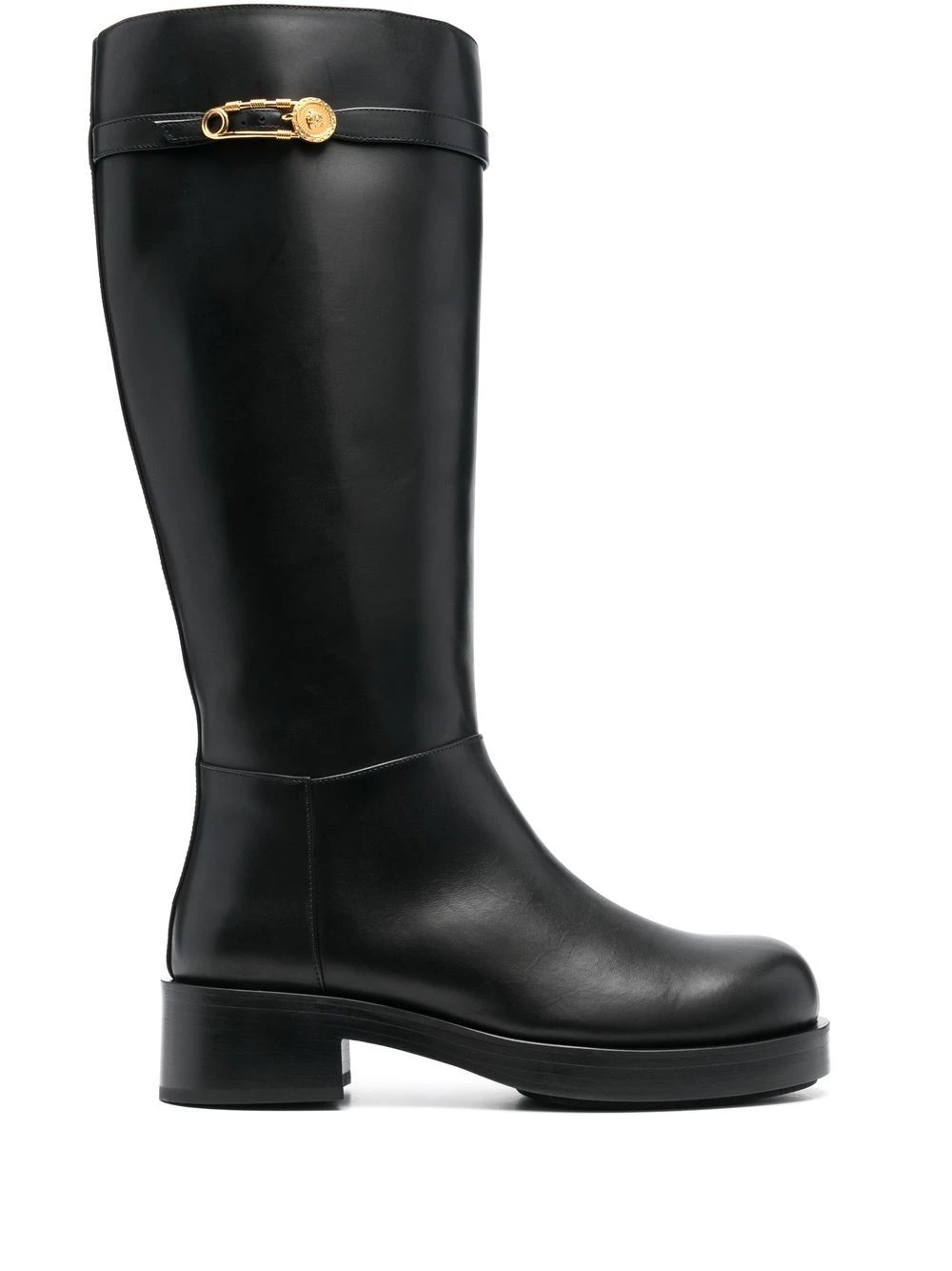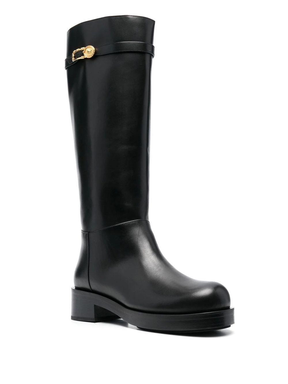 Noir, fini poli, bout rond, semelle épaisse en caoutchouc, détail Medusa, finitions en métal doré.
