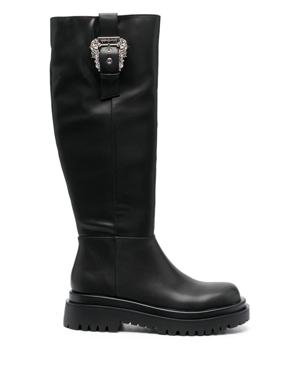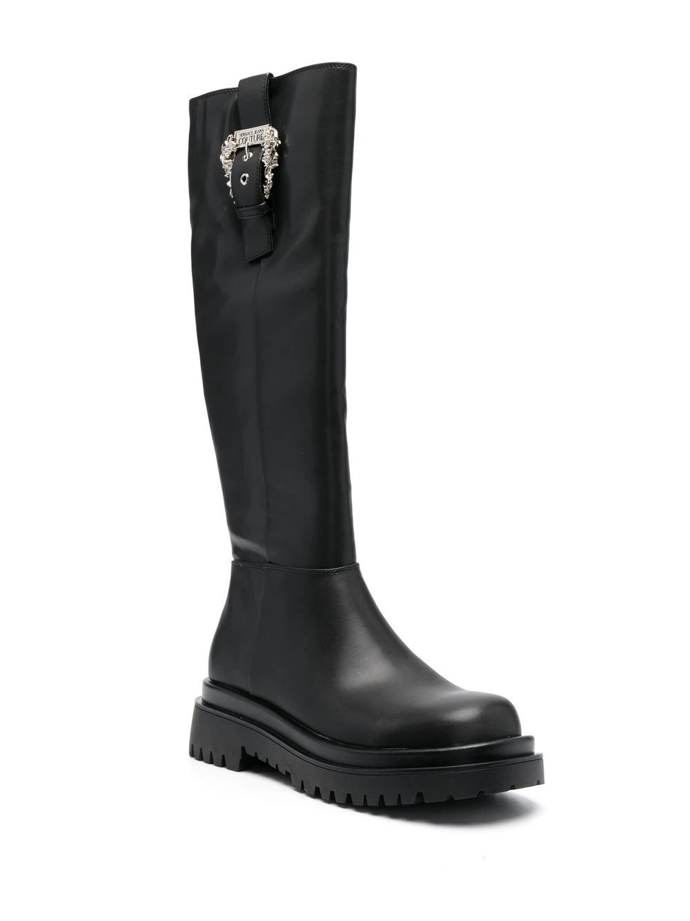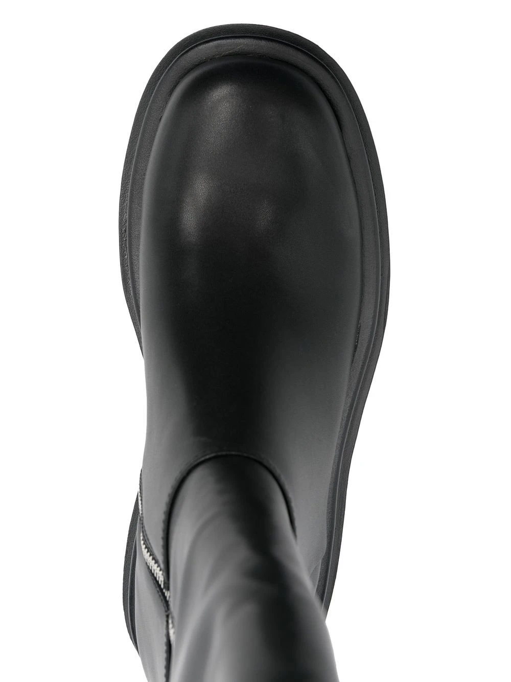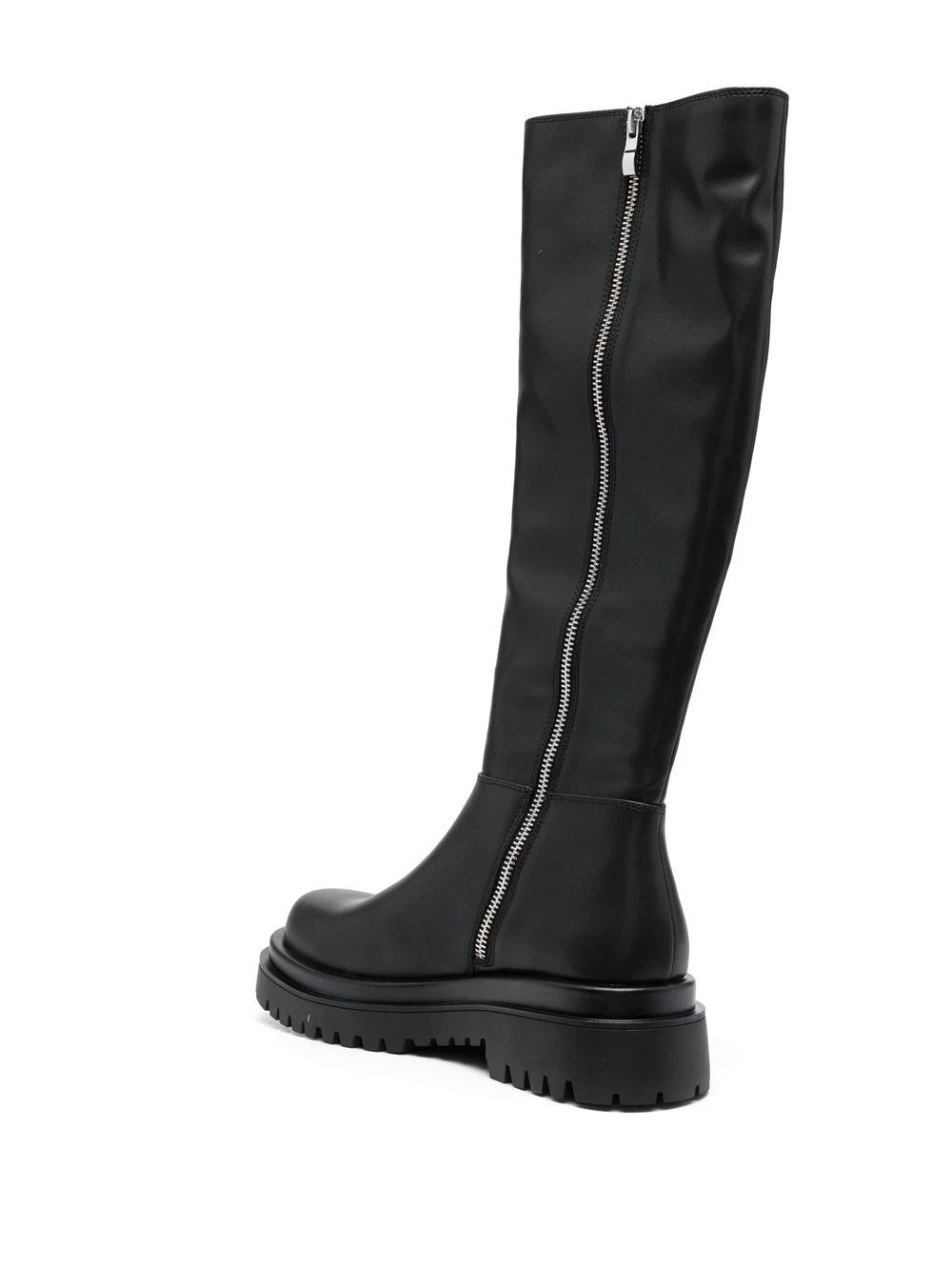 Noir, cuir artificiel, hauteur genou, fermeture zippée sur le côté, bout rond, semelle plate en caoutchouc.