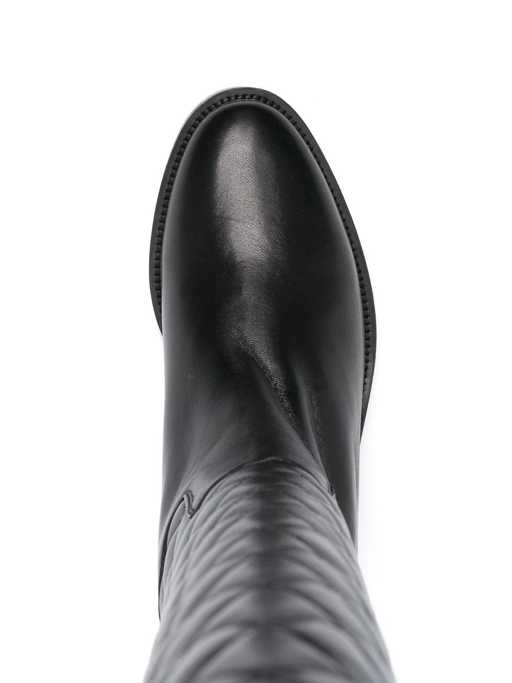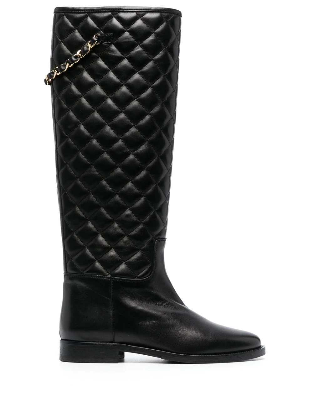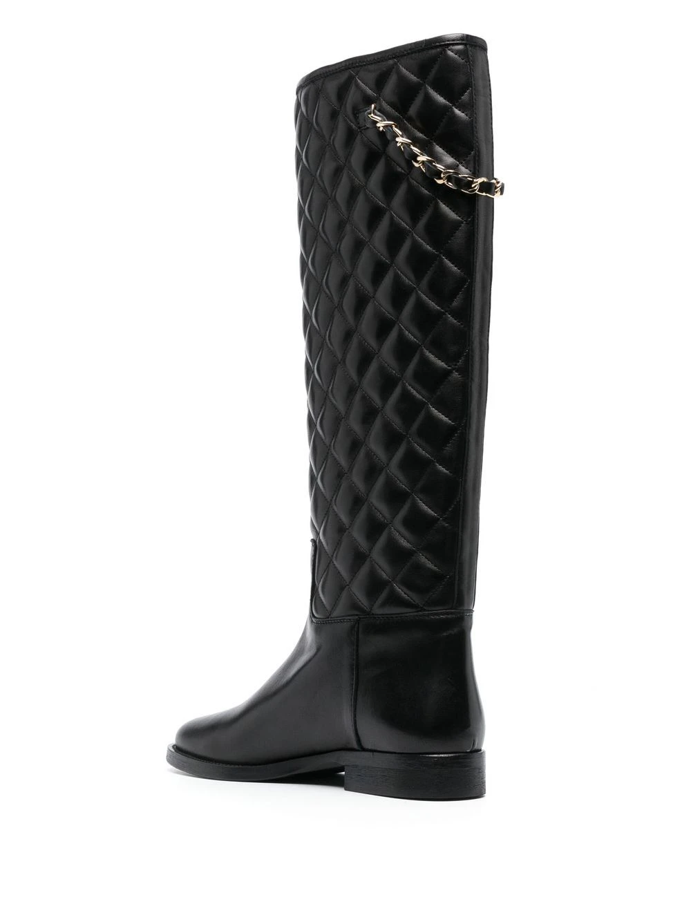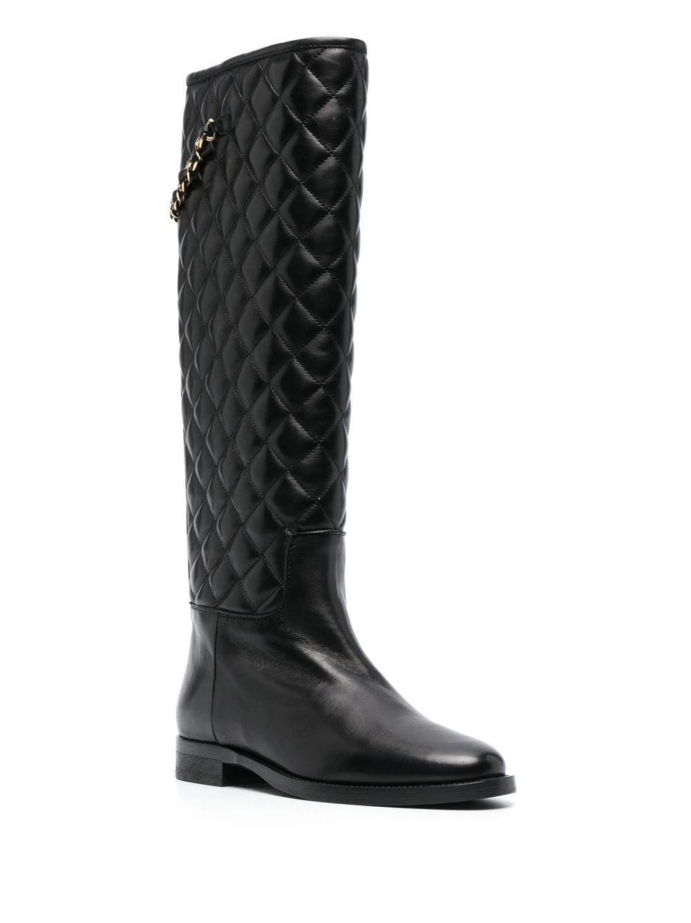 Cuir de veau, design matelassé, détails de chaînes, bout rond, petit talon.