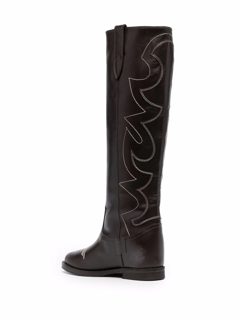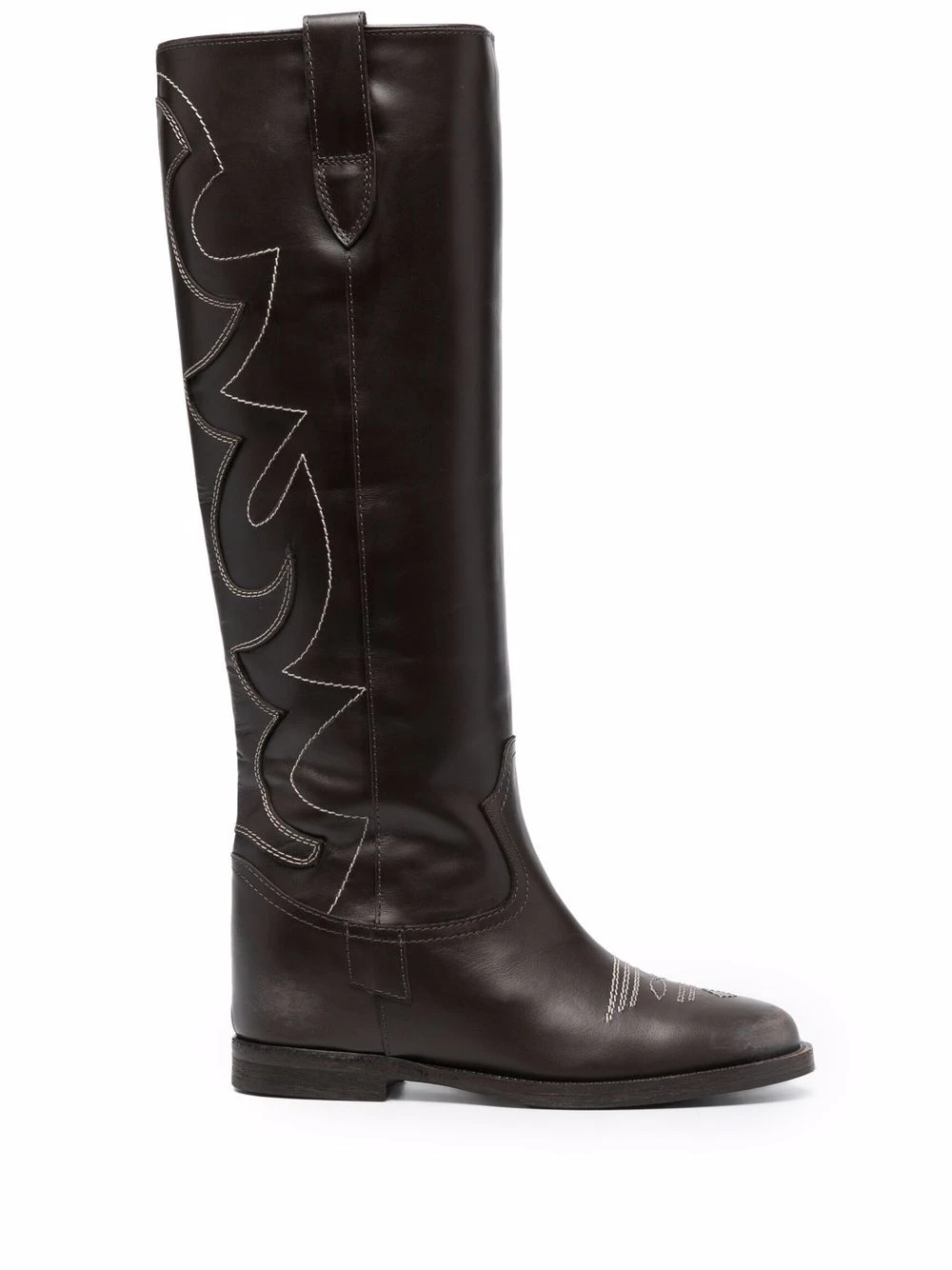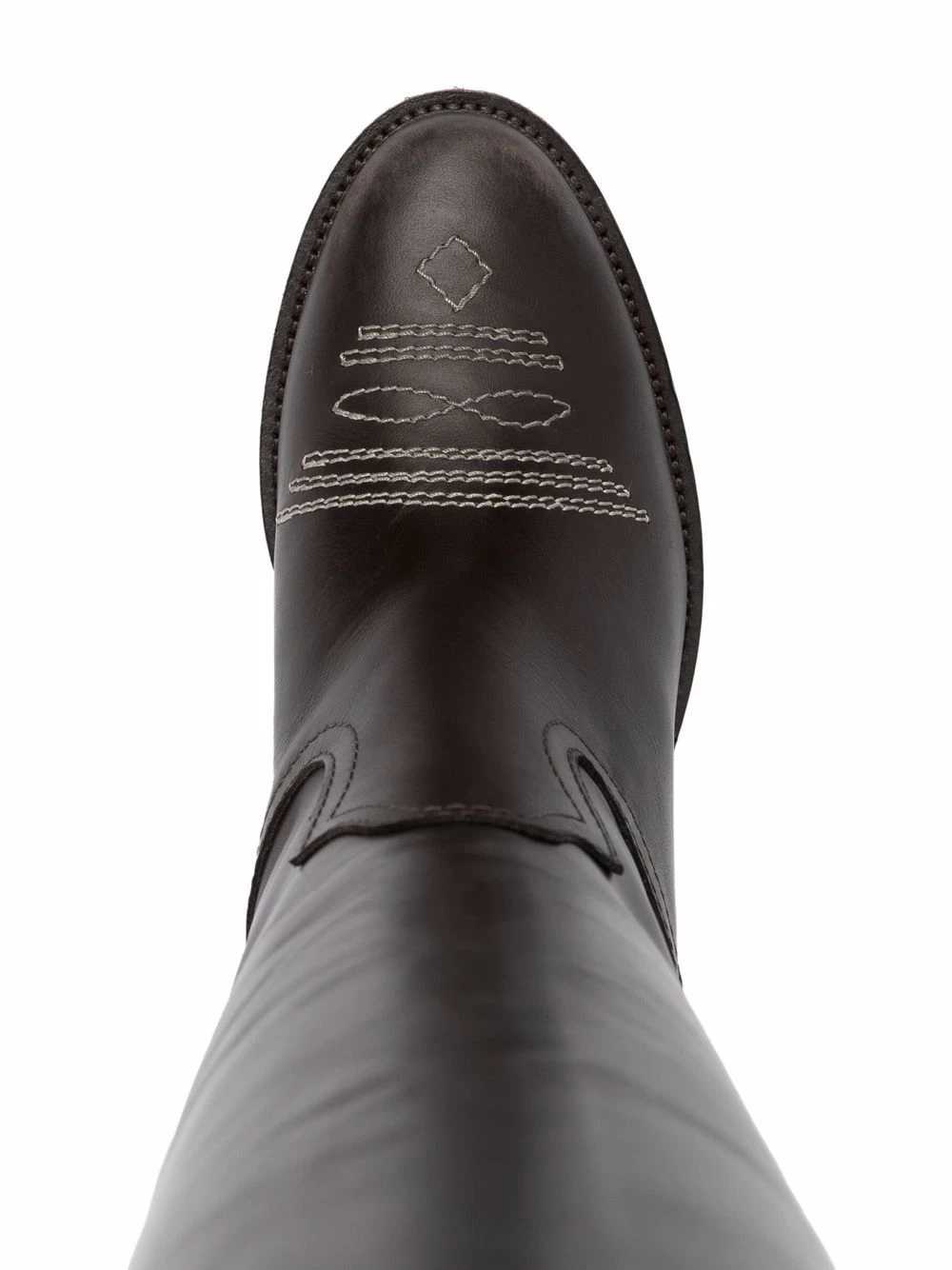 Empiècement d’inspiration Western, coutures contrastantes, bout en amande, hauteur genou, semelle plate. Couleur : noir. Matière : cuir.