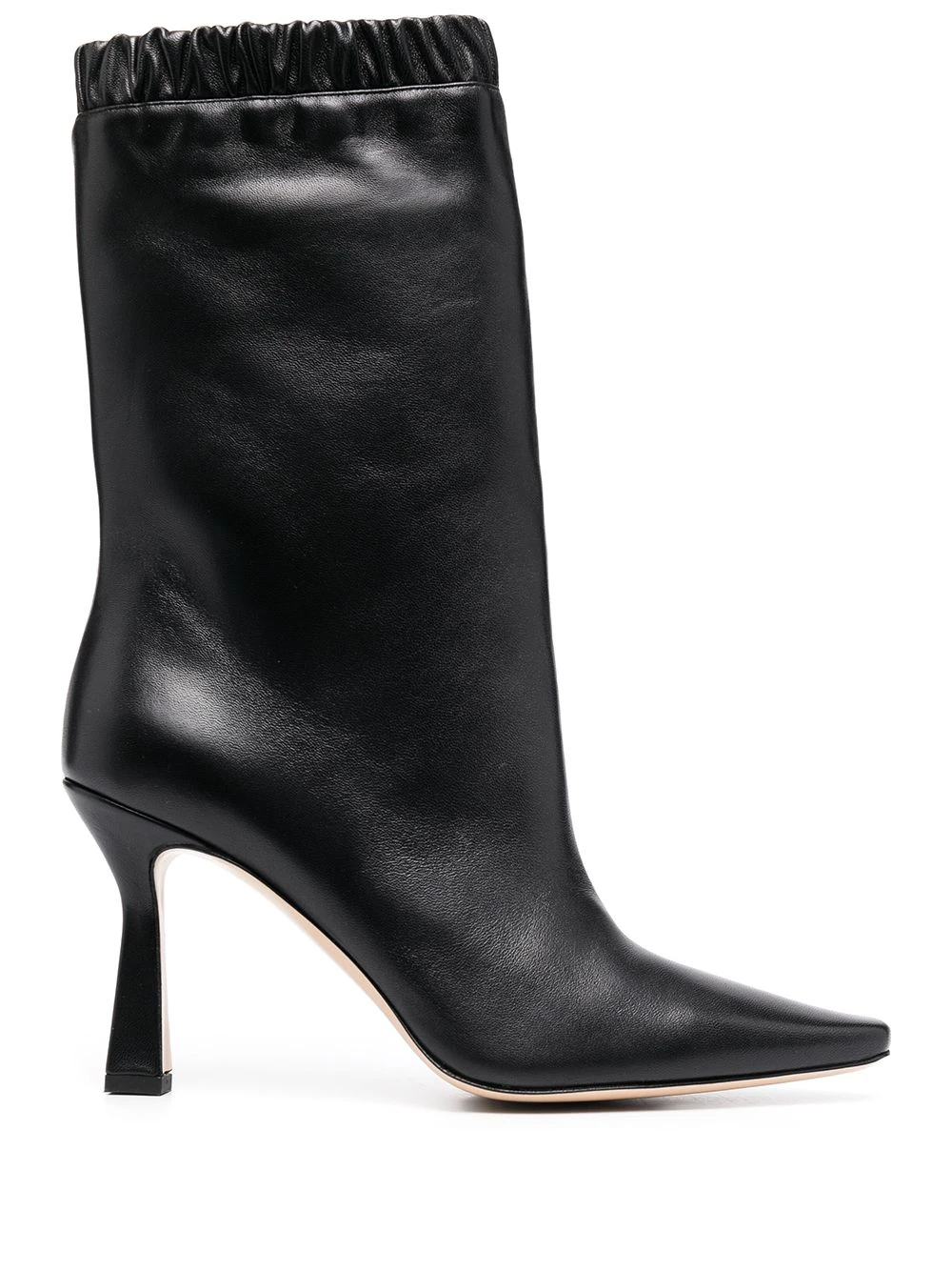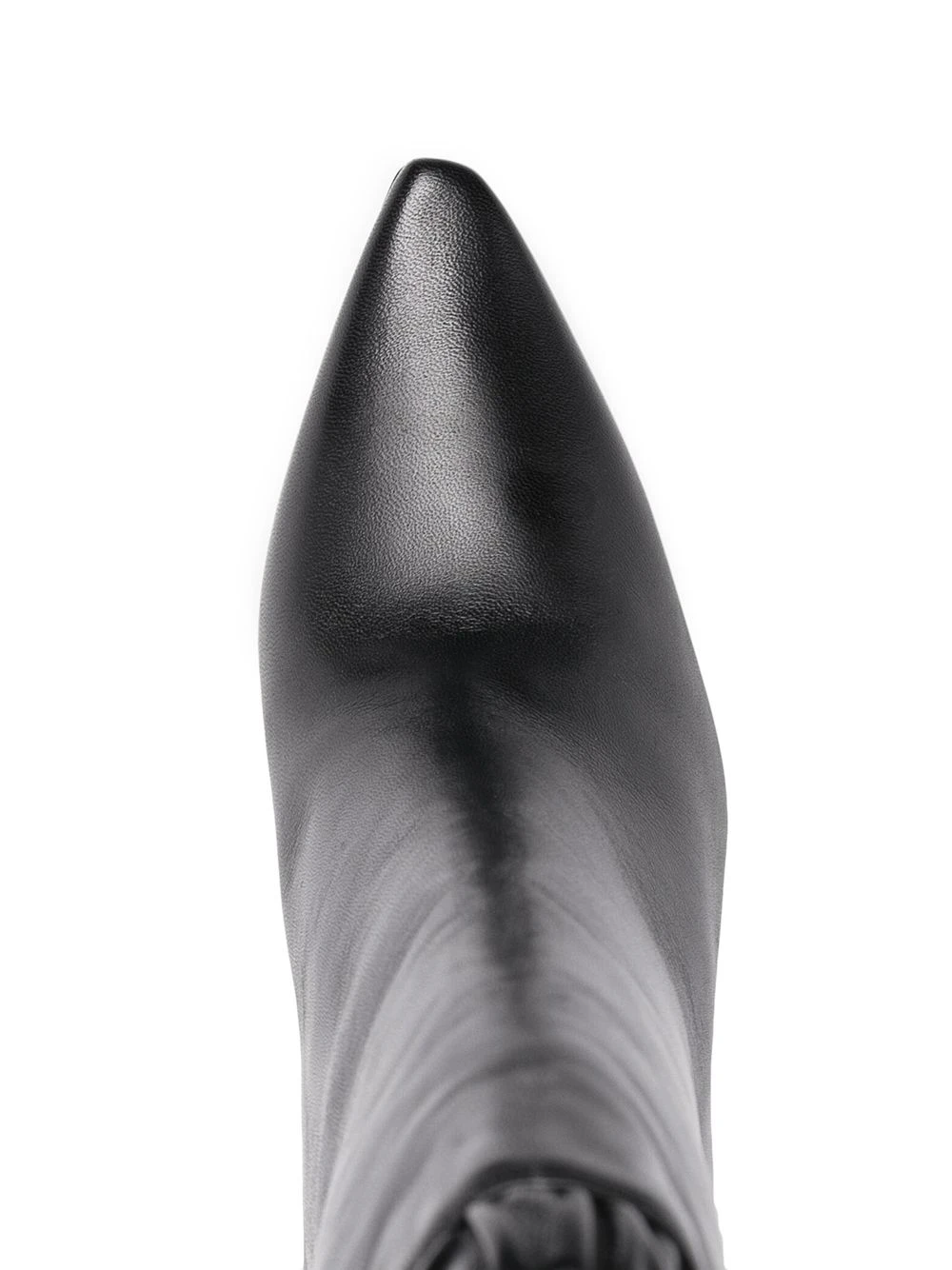 Bout pointu, détails de volants, longueur mollet, talon mi-haut. Couleur : noir. Matière : cuir.