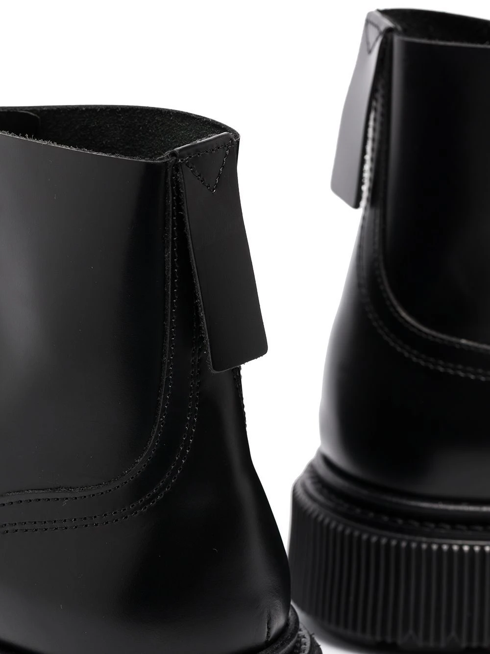 Languette d’enfilage au talon, bout rond, fermeture à lacer sur le devant, hauteur cheville, semelle crantée en caoutchouc. Couleur : noir. Matière : cuir.
