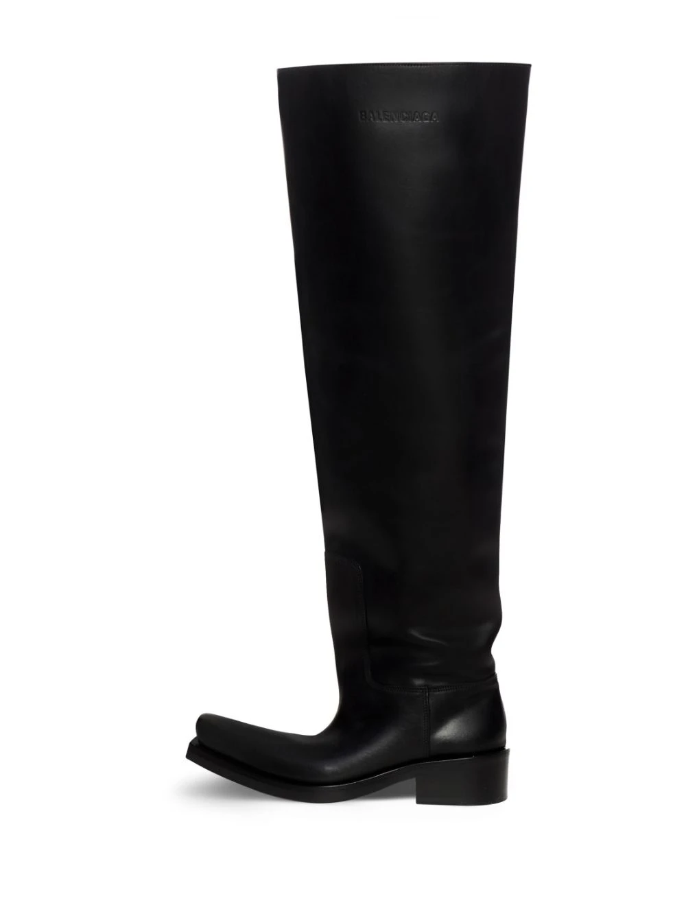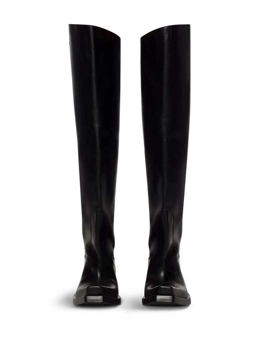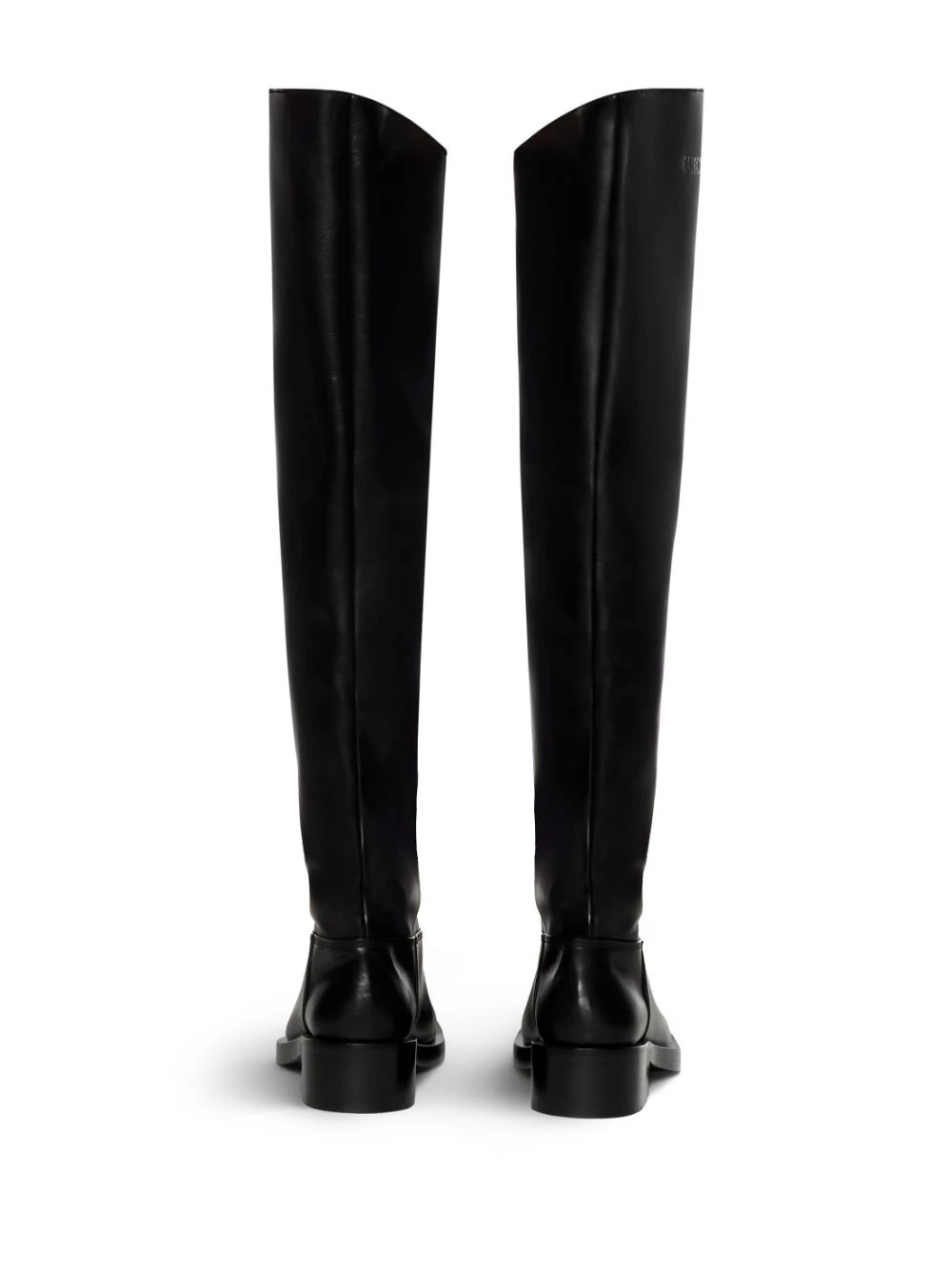 Noir, cuir, grain lisse, logo embossé sur le côté, bout carré, design à enfiler, semelle plate en cuir, hauteur genou. Pour en savoir plus sur ce qui rend un produit responsable, consultez notre page critères POSITIVELY CONSCIOUS.