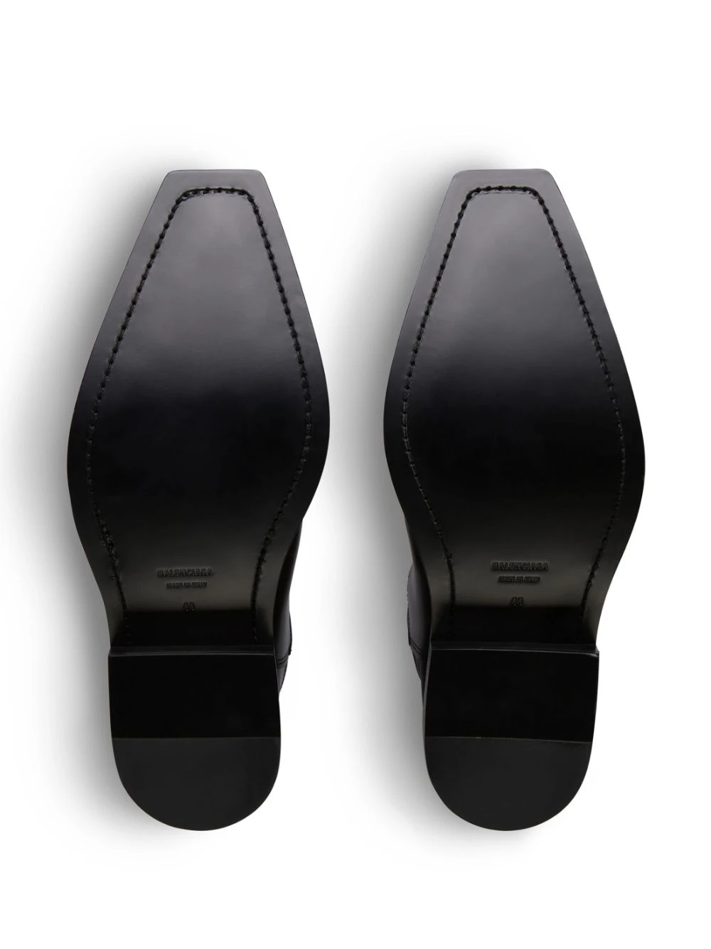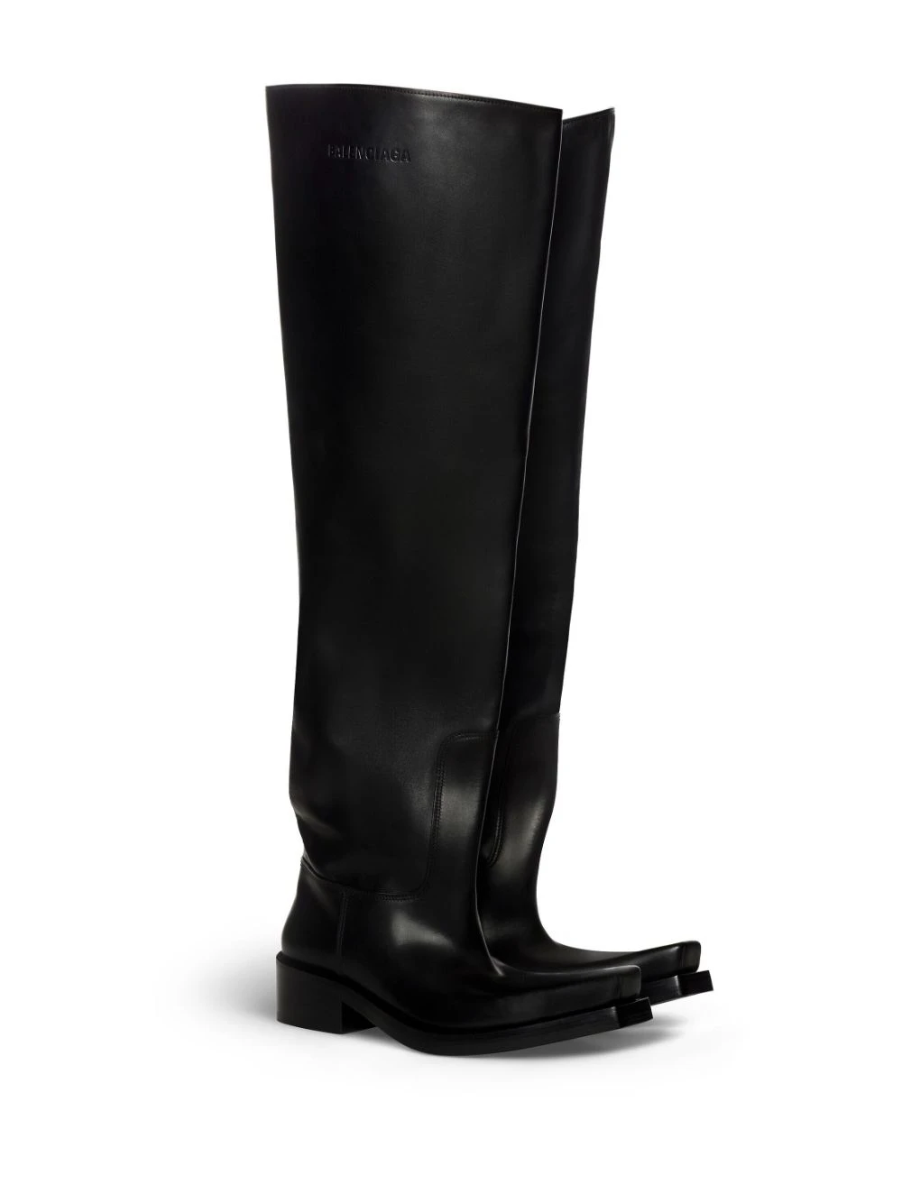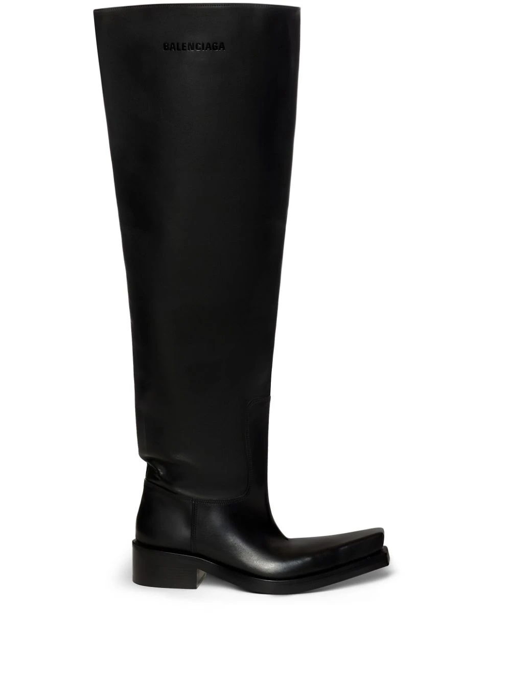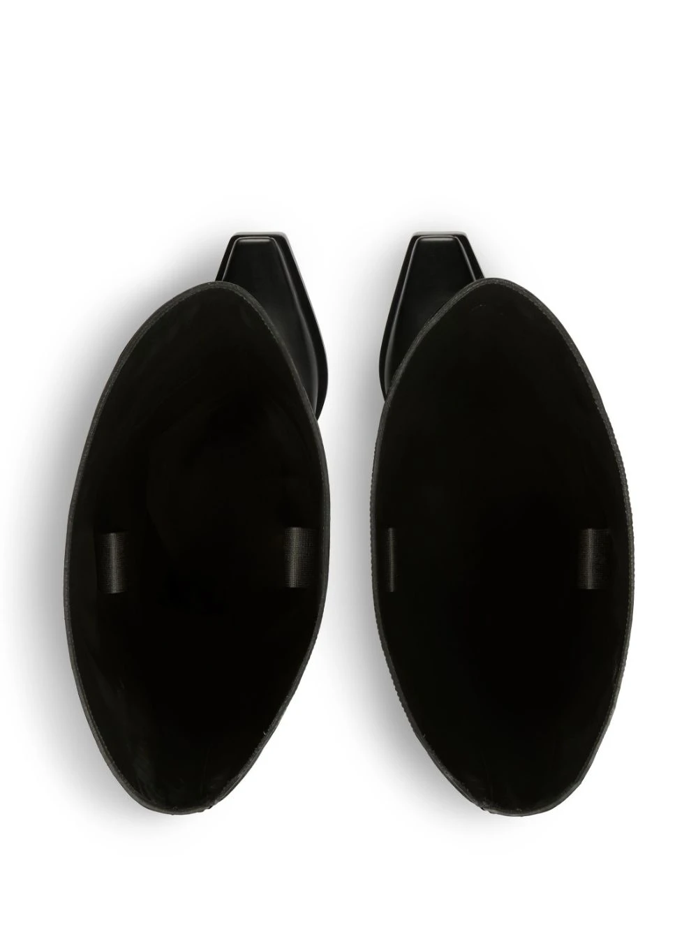 Noir, cuir, grain lisse, logo embossé sur le côté, bout carré, design à enfiler, semelle plate en cuir, hauteur genou. Pour en savoir plus sur ce qui rend un produit responsable, consultez notre page critères POSITIVELY CONSCIOUS.