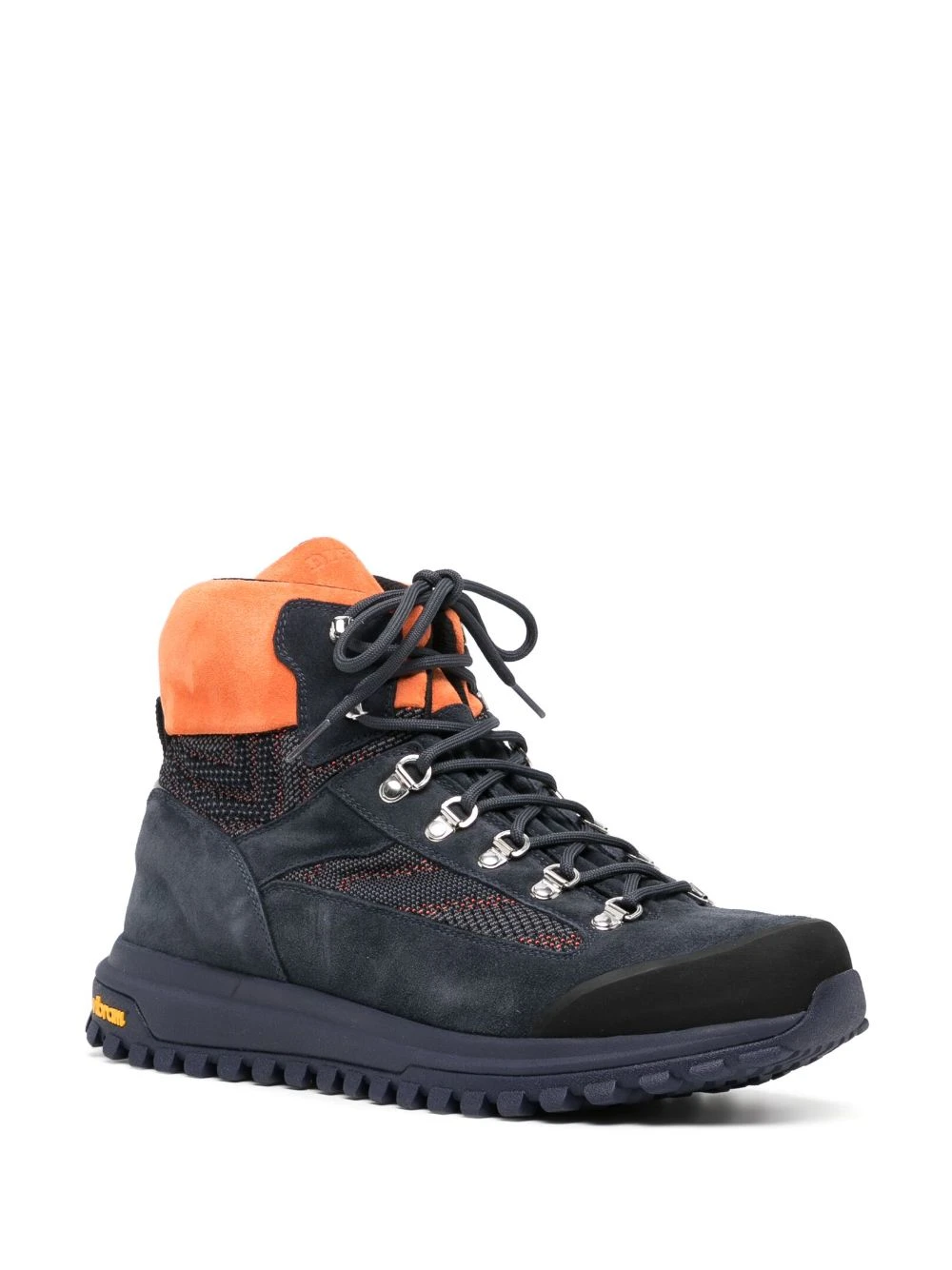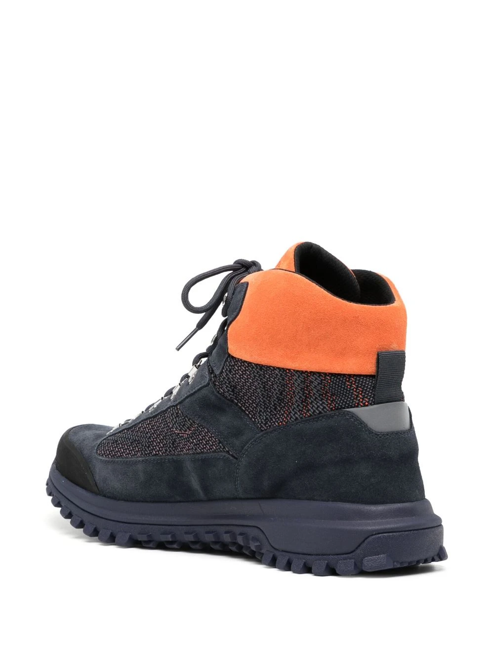 Bleu marine, orange, cuir, modèle bicolore, empiècement en mesh, languette à logo embossé, logo sur la semelle, languette d’enfilage au talon, bout rond, fermeture à lacer sur le devant, semelle plate en caoutchouc.