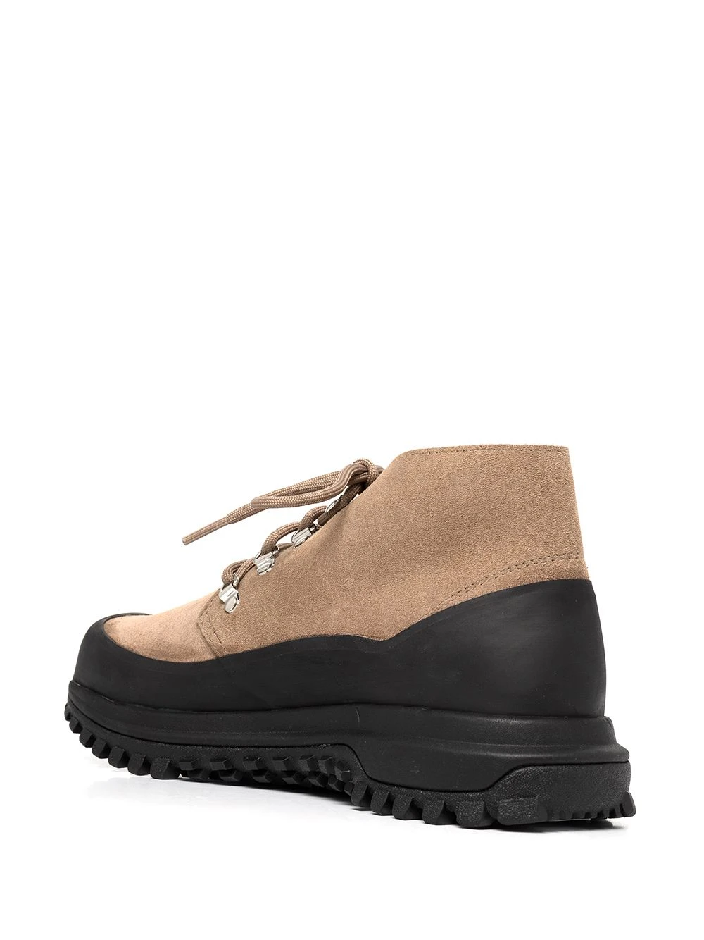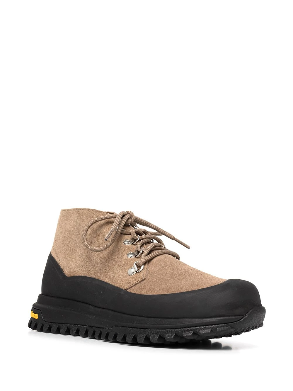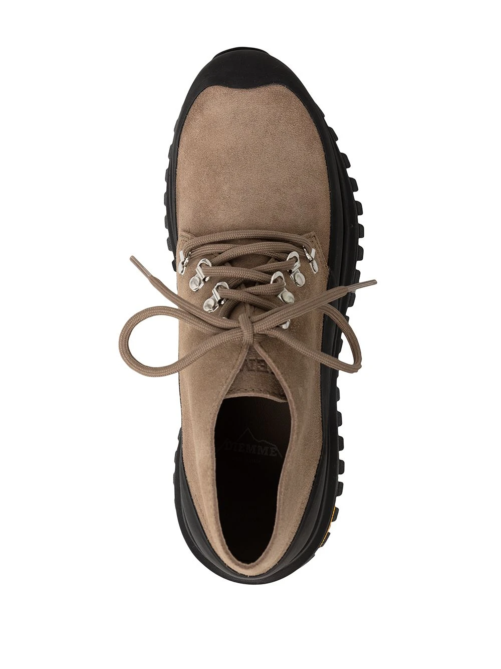 Marron clair, noir, cuir, bout rond, fermeture à lacer sur le devant, semelle Vibram®.