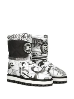 Noir/blanc, peau d’agneau, peau de chèvre, cuir de veau, imprimé graffiti, logo imprimé sur le côté, bout rond, fermeture à lacer sur le devant, languette à patch logo, languette d’enfilage au talon, hauteur cheville, semelle crantée en caoutchouc.