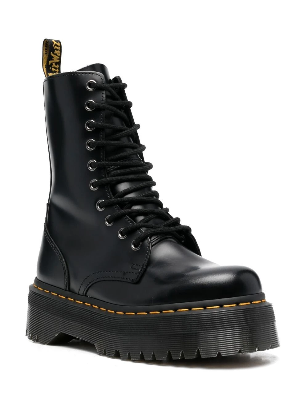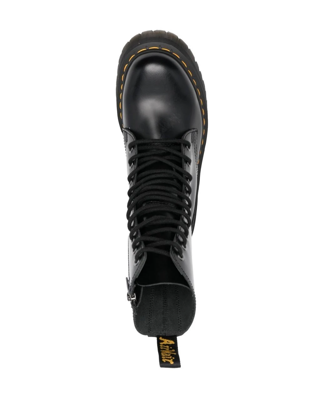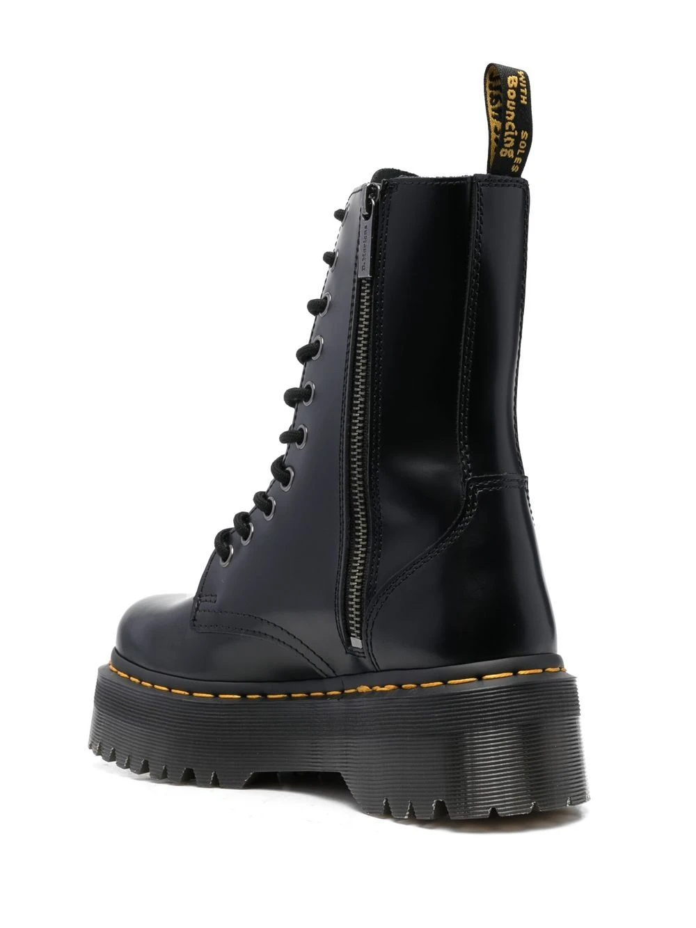 Noir de jais, cuir, détails d’œillets, fermeture à lacer sur le devant, bout rond, semelle épaisse en caoutchouc.