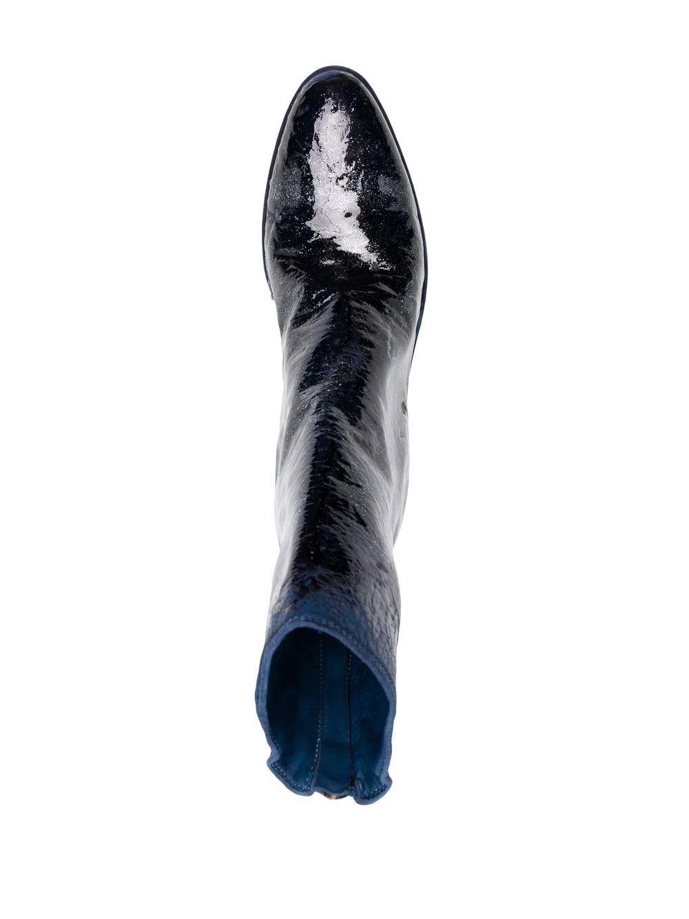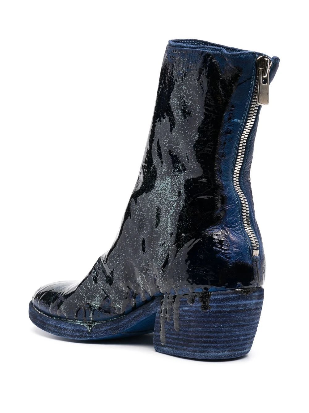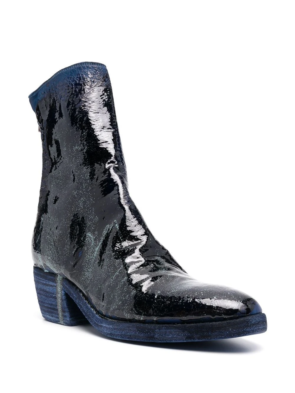 Cuir, bleu, design peint à la main, fini verni, fermeture zippée sur les côtés, petit talon épais, bout rond.