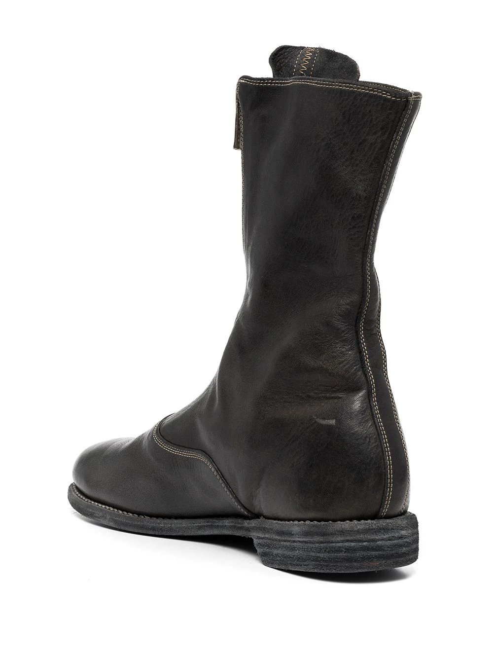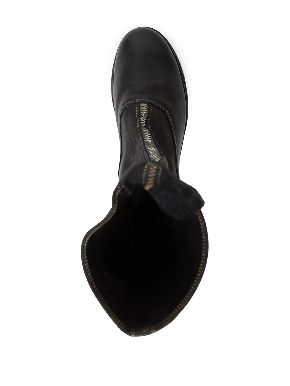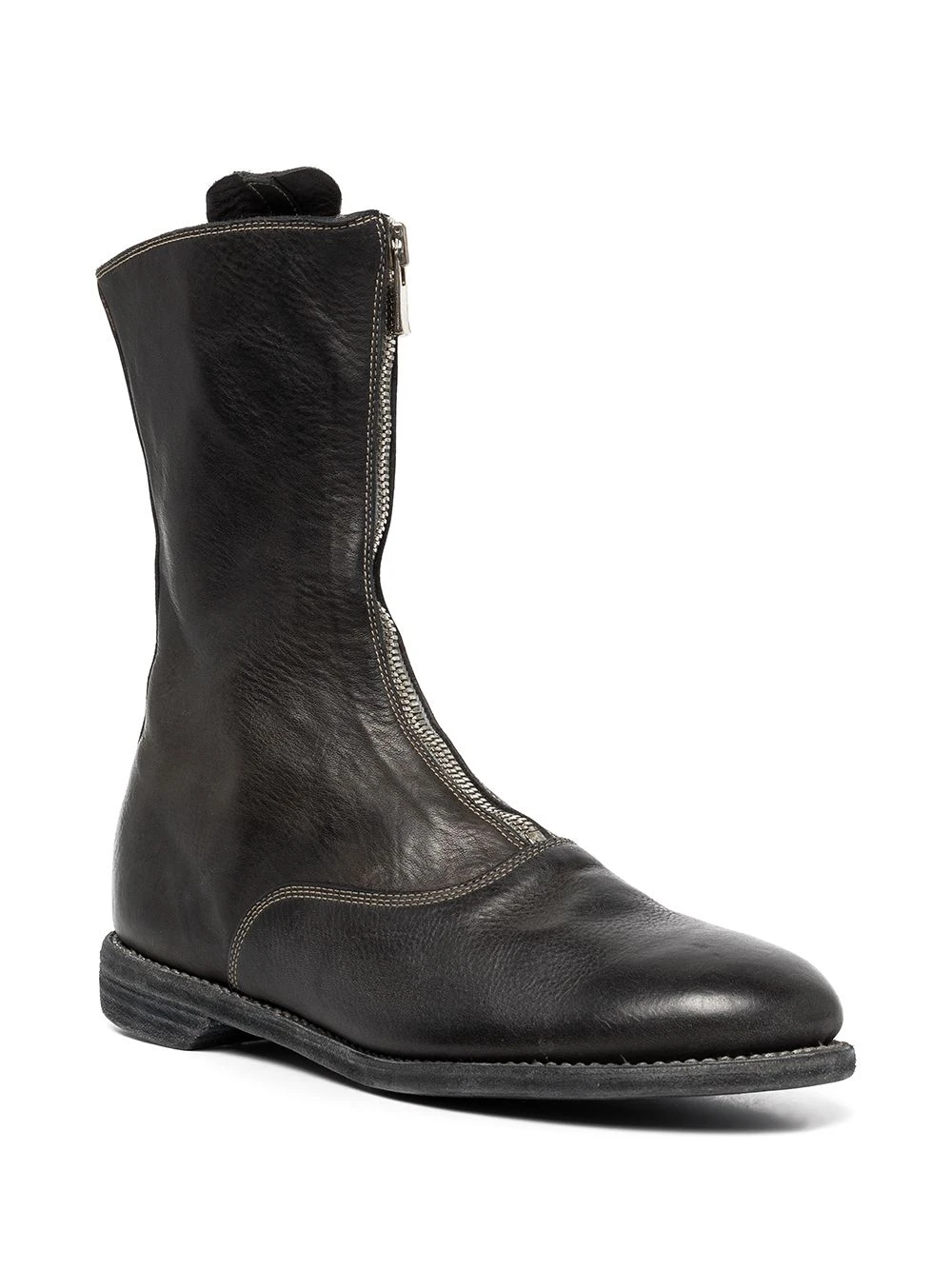 Bout rond, fermeture zippée devant, petit talon épais. Couleur : noir. Matière : cuir.