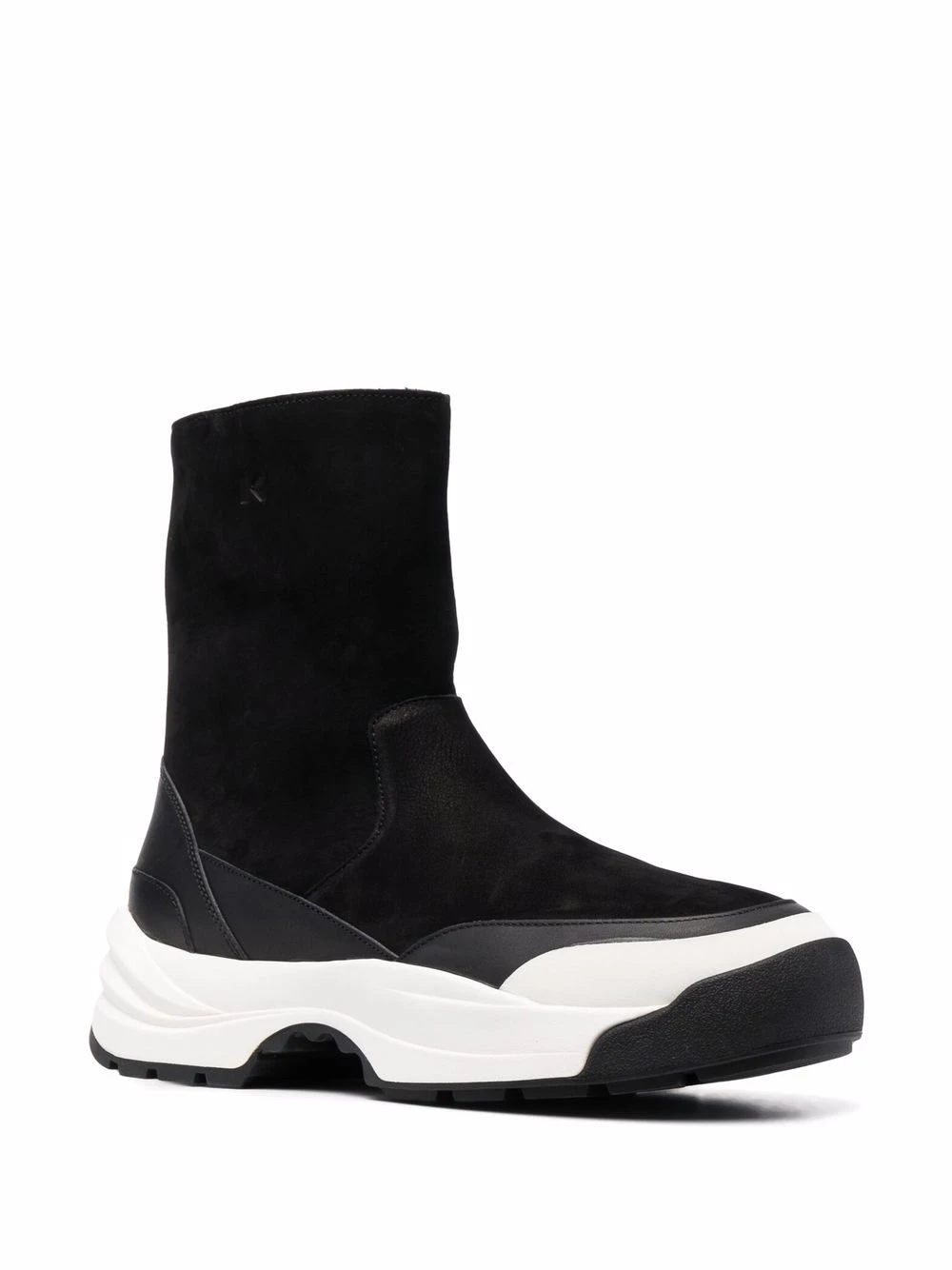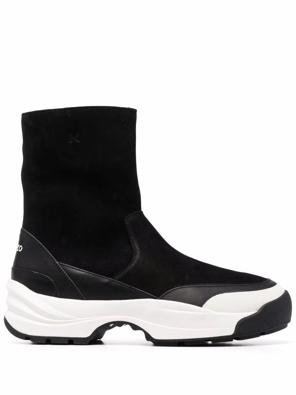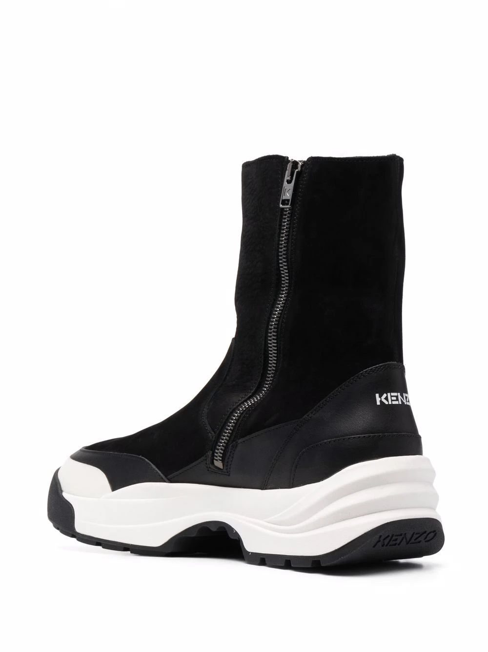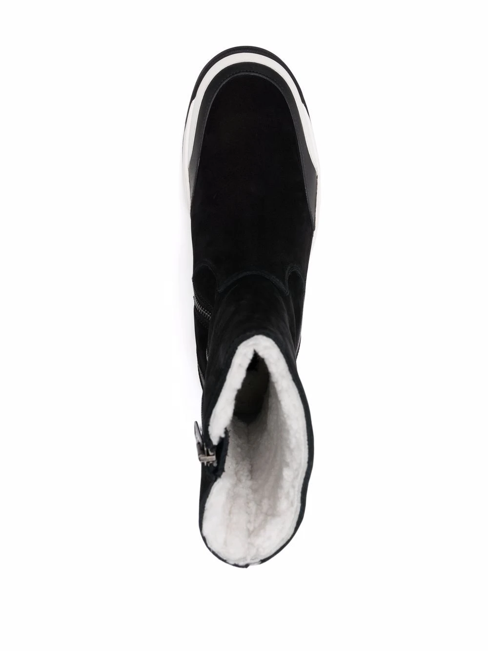 Daim, doublure en mouton retourné, modèle bicolore, logo embossé sur le côté, bout rond, coutures ton sur ton, fermeture zippée sur le côté, logo imprimé à l’arrière, semelle épaisse en caoutchouc, logo sur la semelle. Matière : cuir.