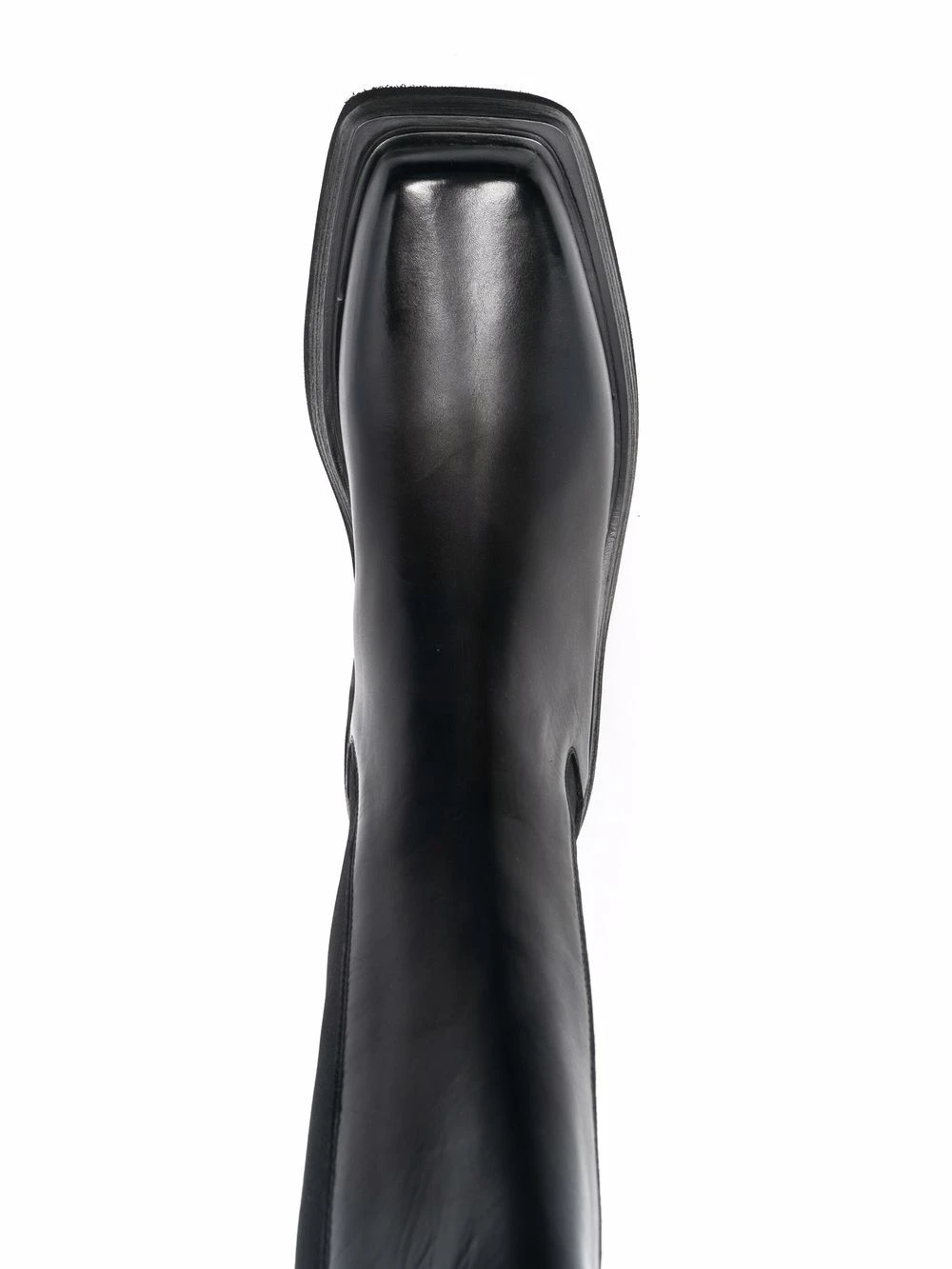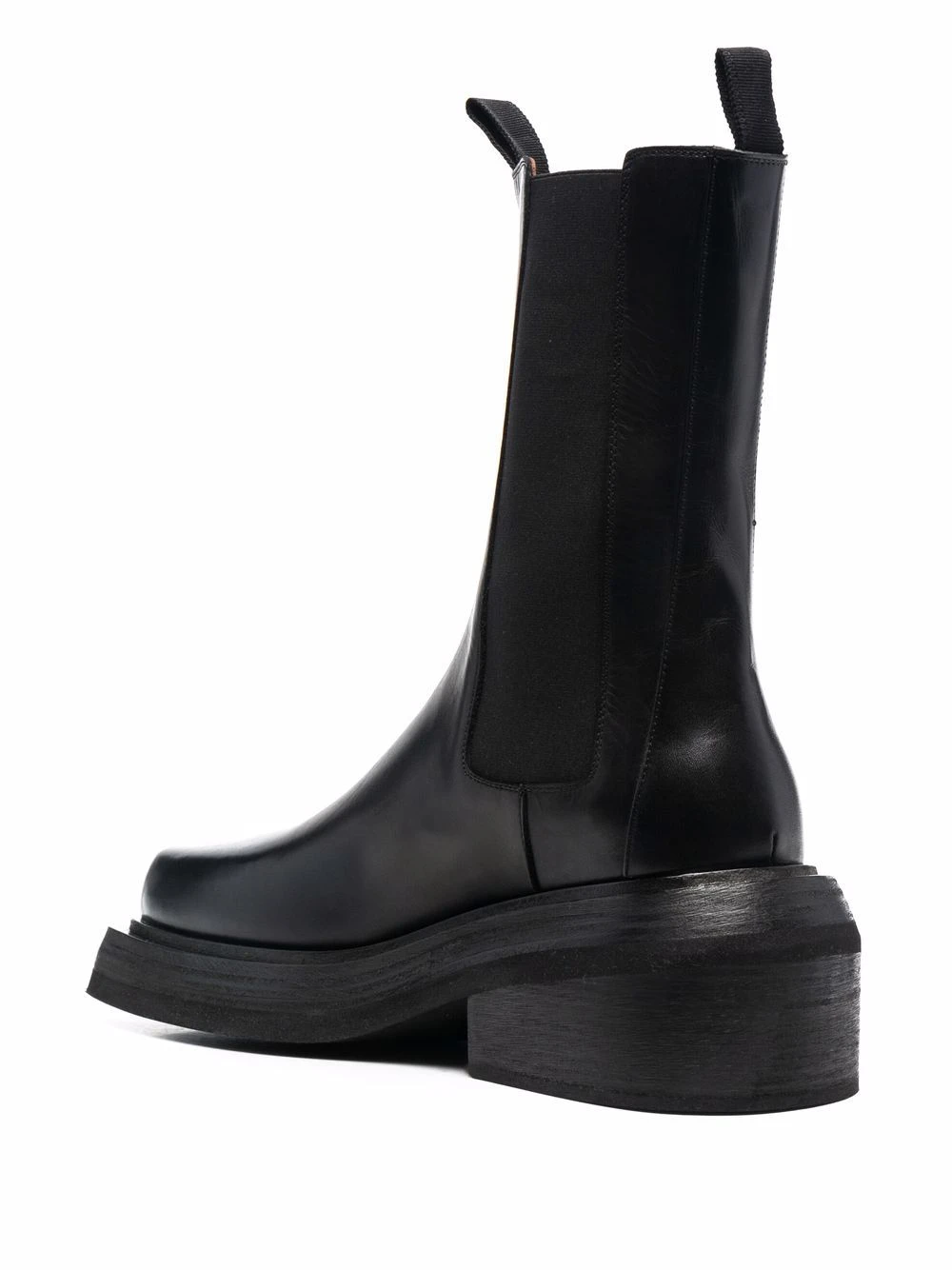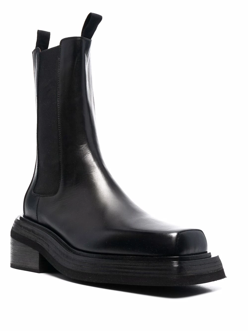 Bout carré, ouverture à double languette, empiècements élastiqués sur les côtés, semelle épaisse en caoutchouc. Couleur : noir. Matière : cuir.