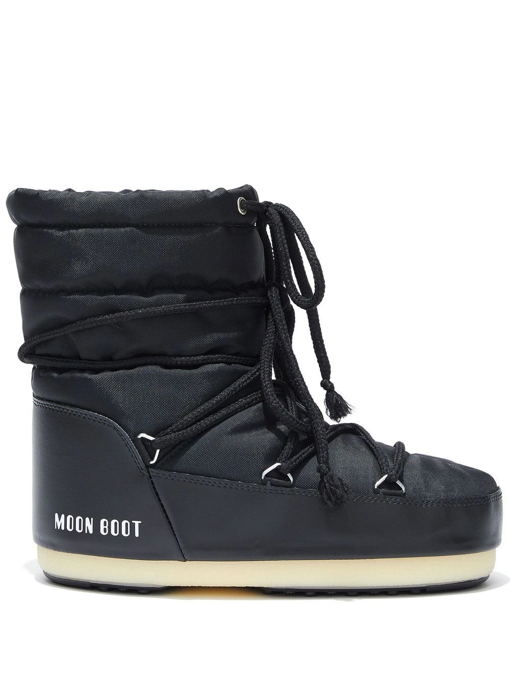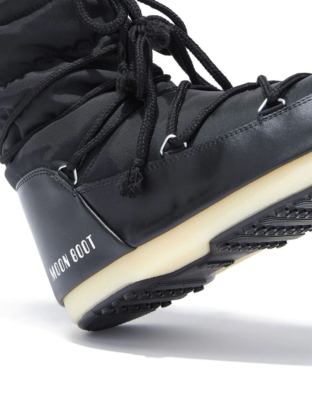 Bottes matelassées à logo imprimé Moon Boot avec noir, design matelassé, design matelassé, logo imprimé sur le côté, fermeture à lacer sur le devant, poignets à lien de resserrage, bout rond et semelle plate en caoutchouc.