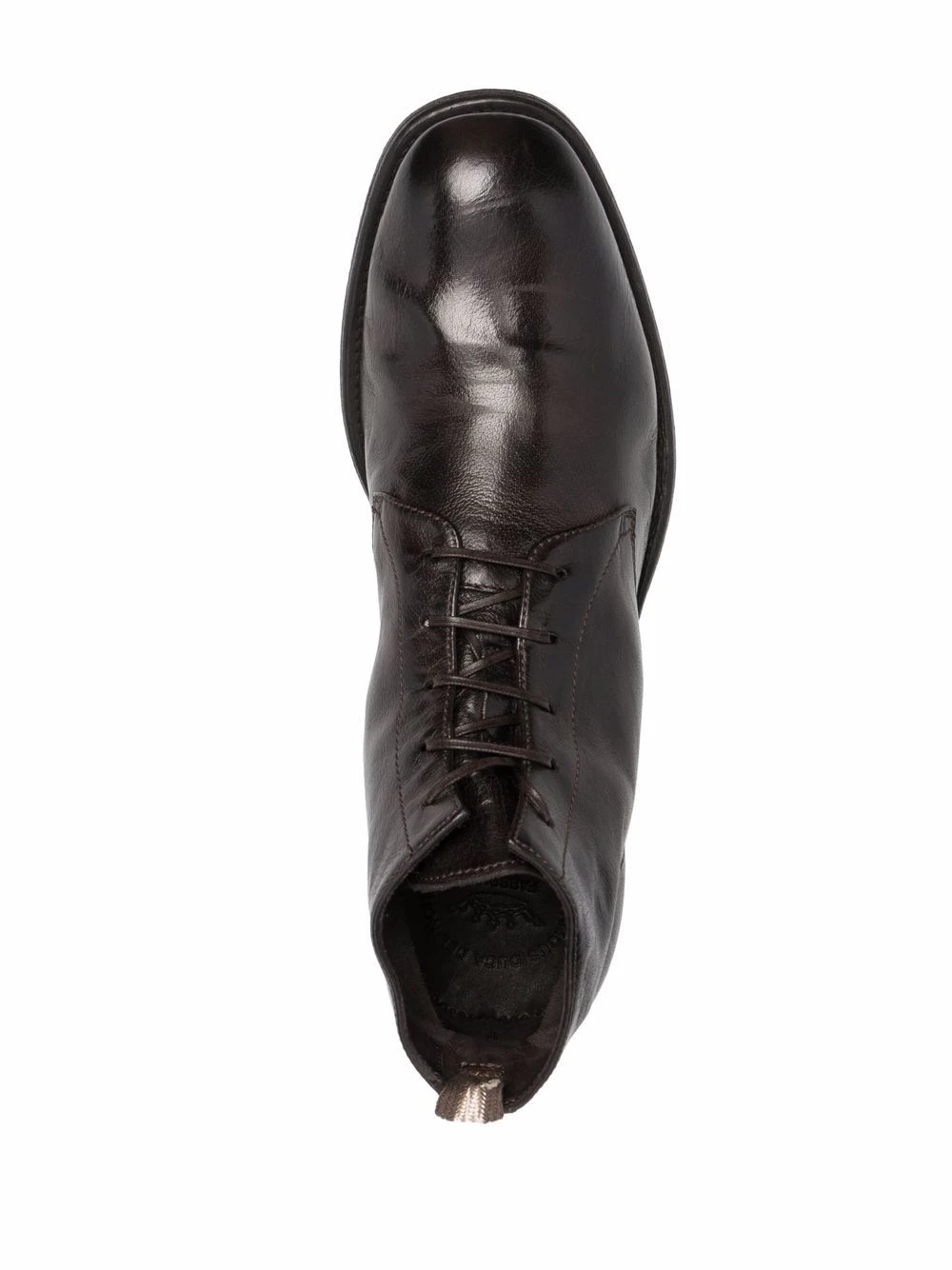 Languette d’enfilage au talon, bout rond, fermeture à lacer sur le devant, semelle plate. Couleur : marron.