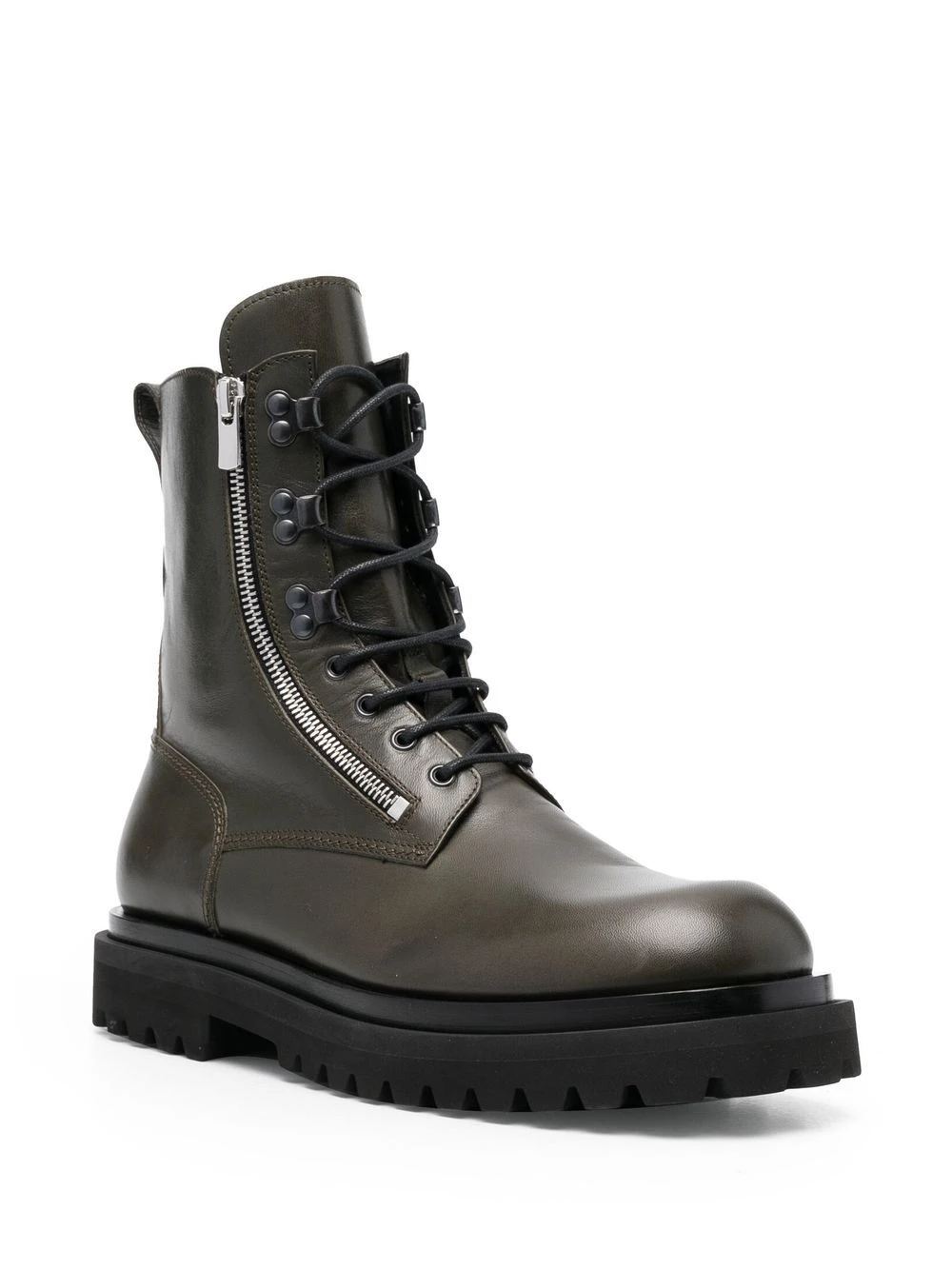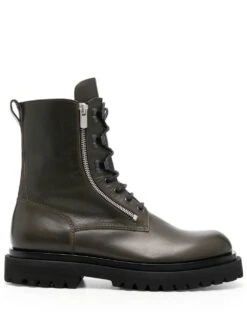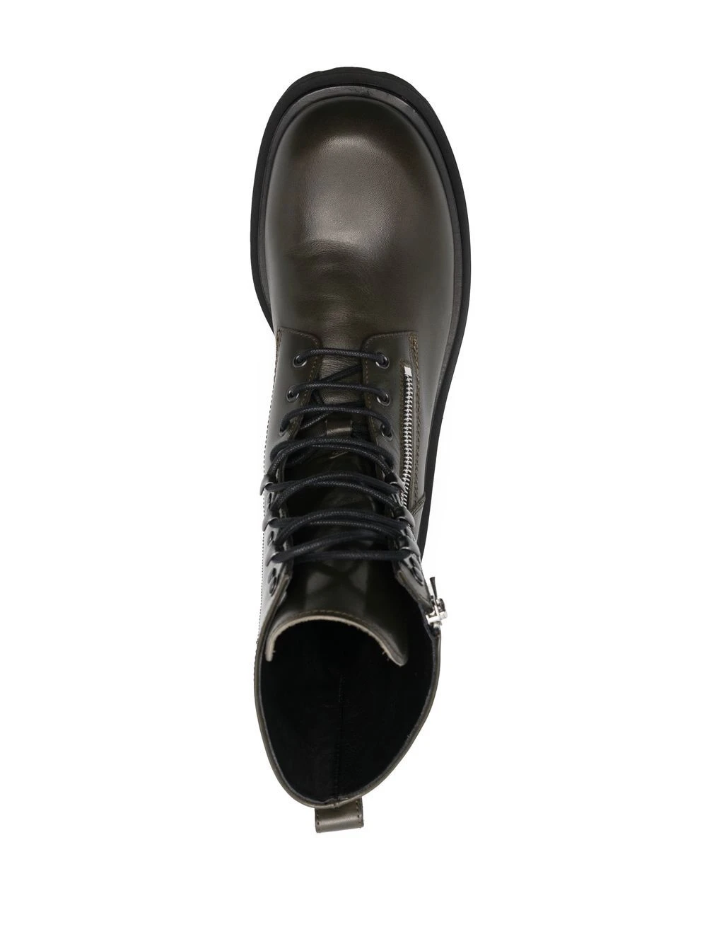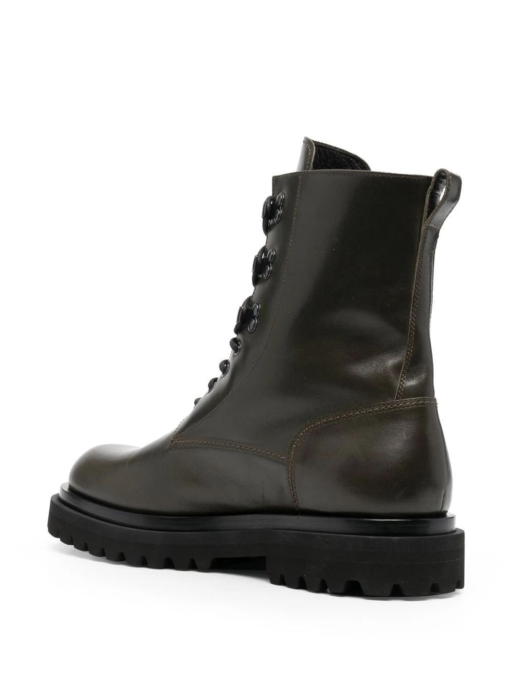 Vert, cuir de veau, cuir, bout rond, fermeture à lacer sur le devant, hauteur cheville, semelle en caoutchouc, petit talon.