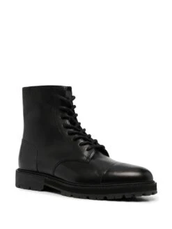 Tweed, bout rond, fermeture à lacer sur le devant, hauteur cheville, semelle plate en caoutchouc. Matière : cuir.