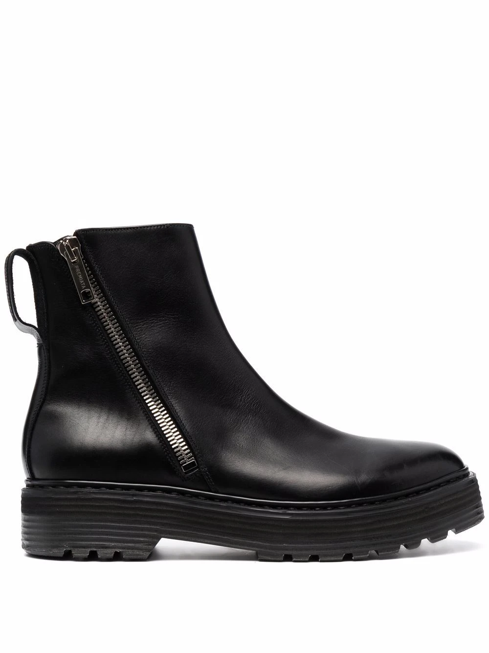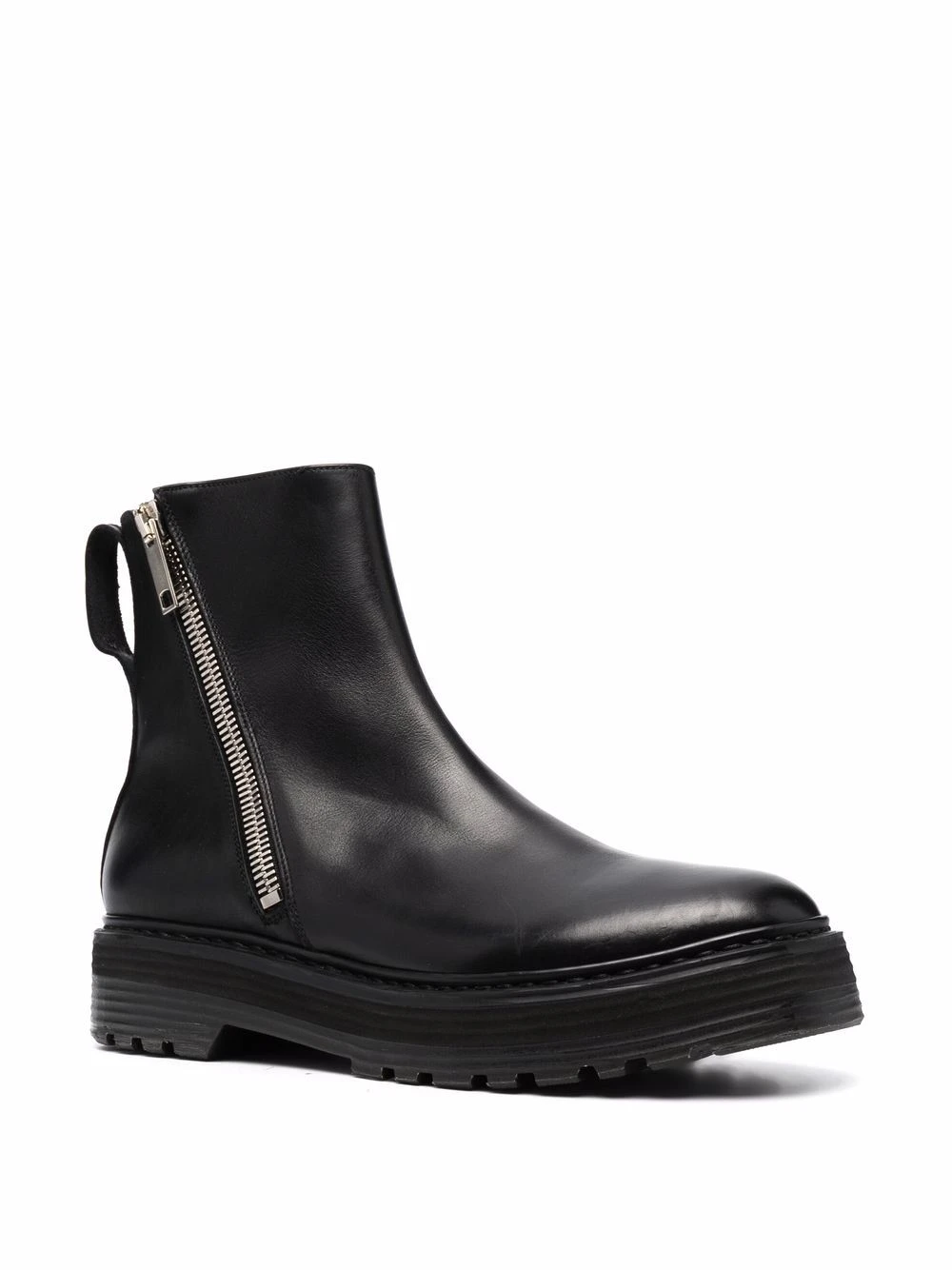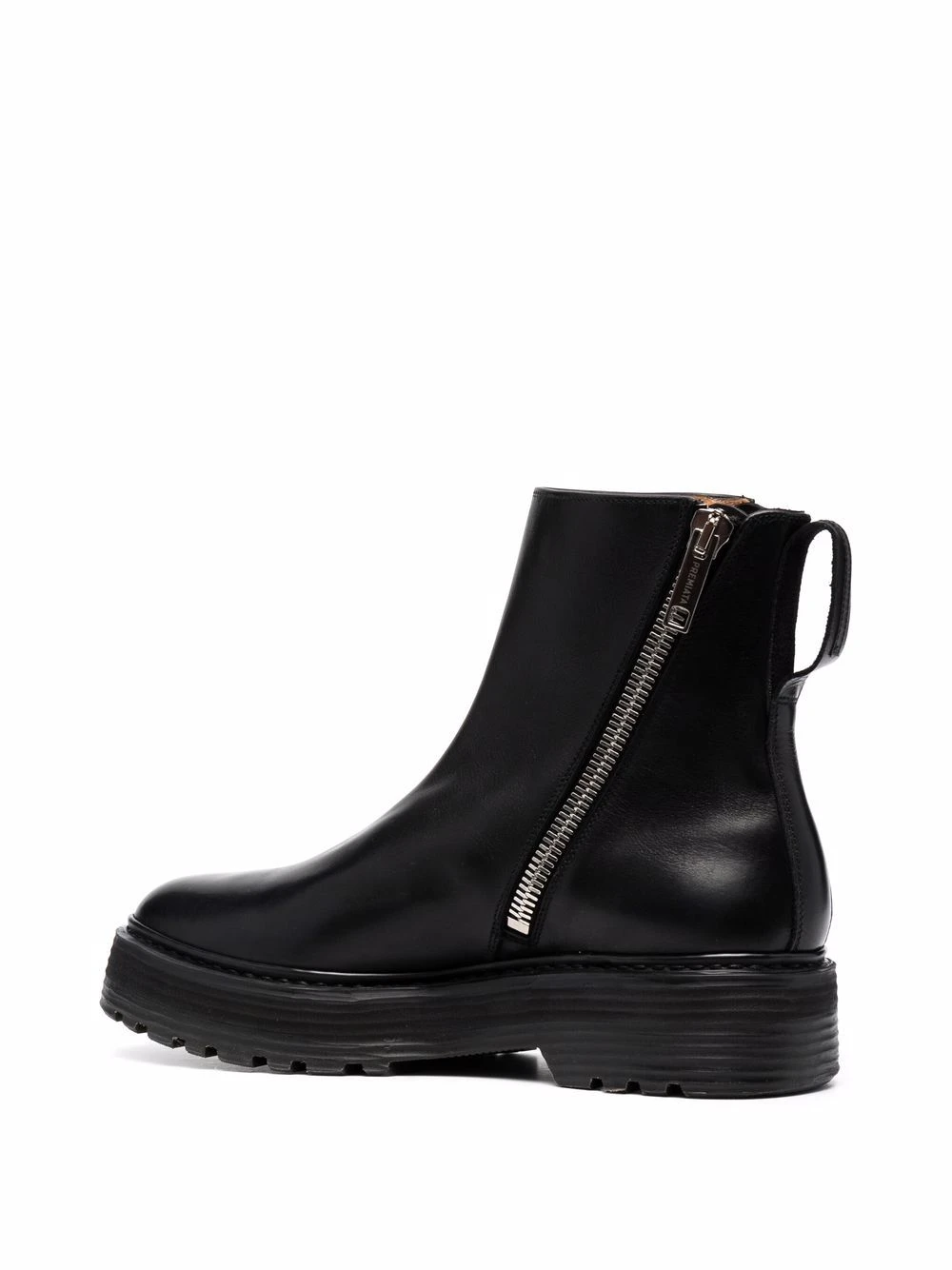 Languette d’enfilage au talon, fermeture zippée sur les côtés, bout rond, semelle crantée en caoutchouc. Couleur : noir. Matière : cuir.