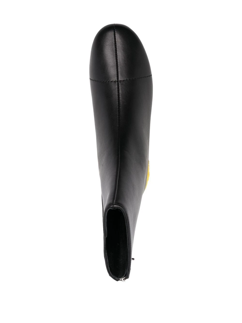 Longueur mollet, fermeture zippée à l’arrière, bout rond, petit talon épais. Matière : cuir.