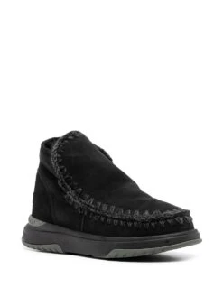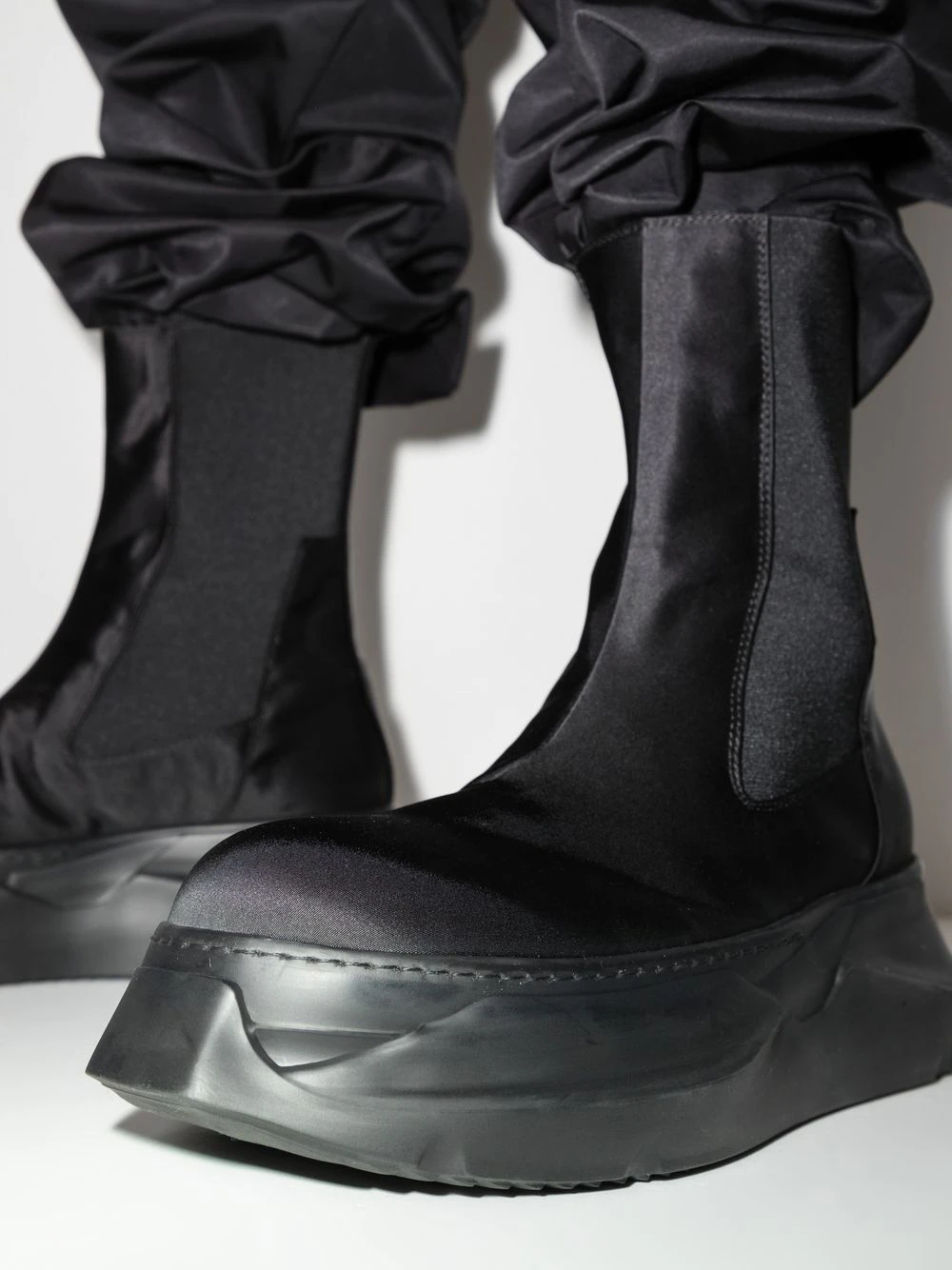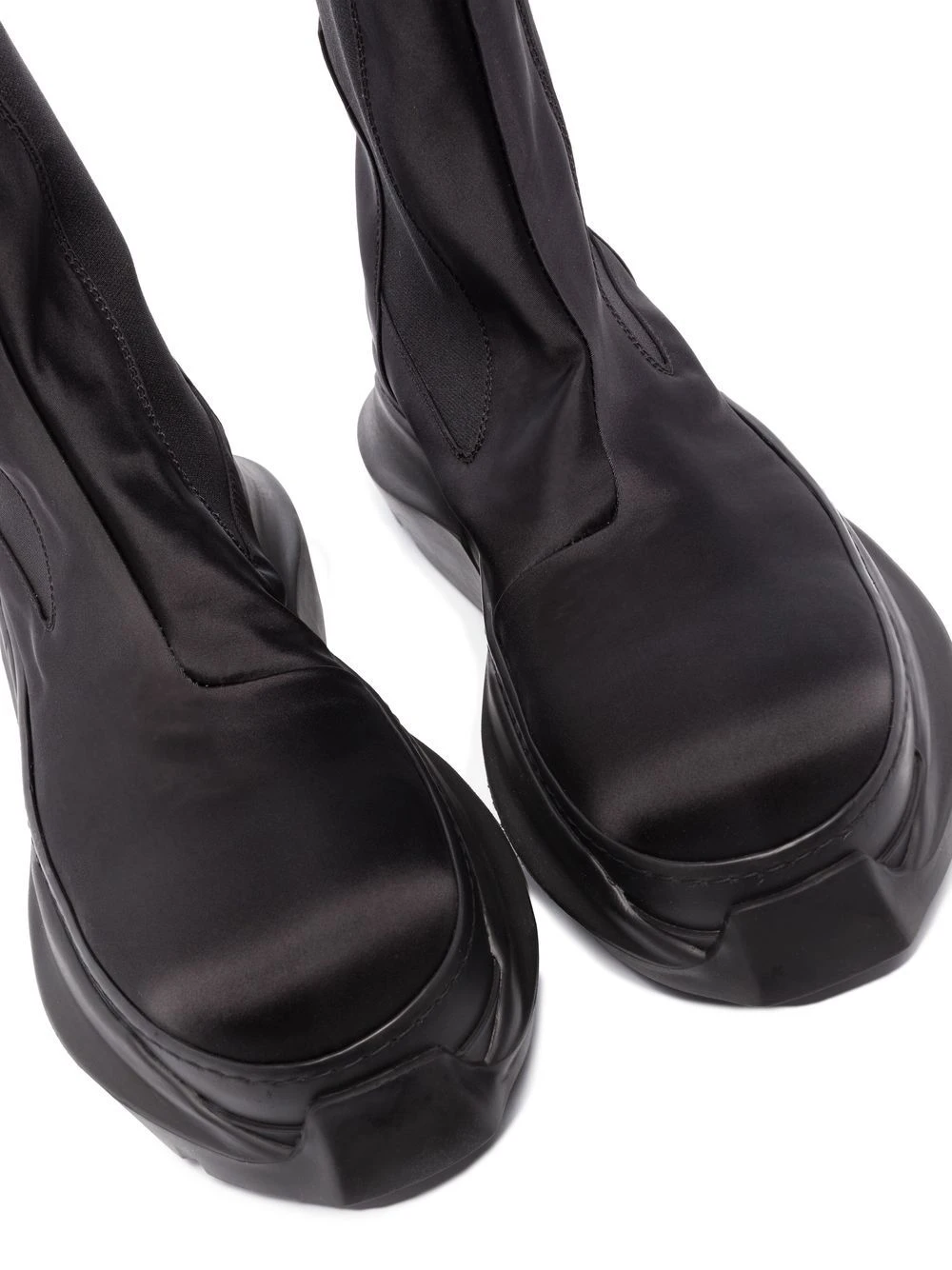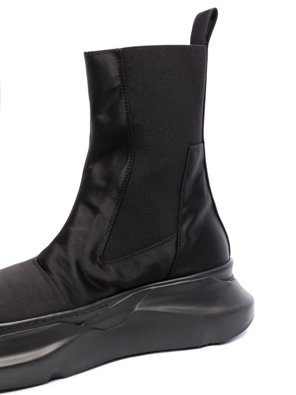 Design à empiècements, fini satiné, bout en amande, empiècements élastiqués sur les côtés, longueur midi, languette d’enfilage au talon, semelle épaisse en caoutchouc. Couleur : noir. Matière : cuir.