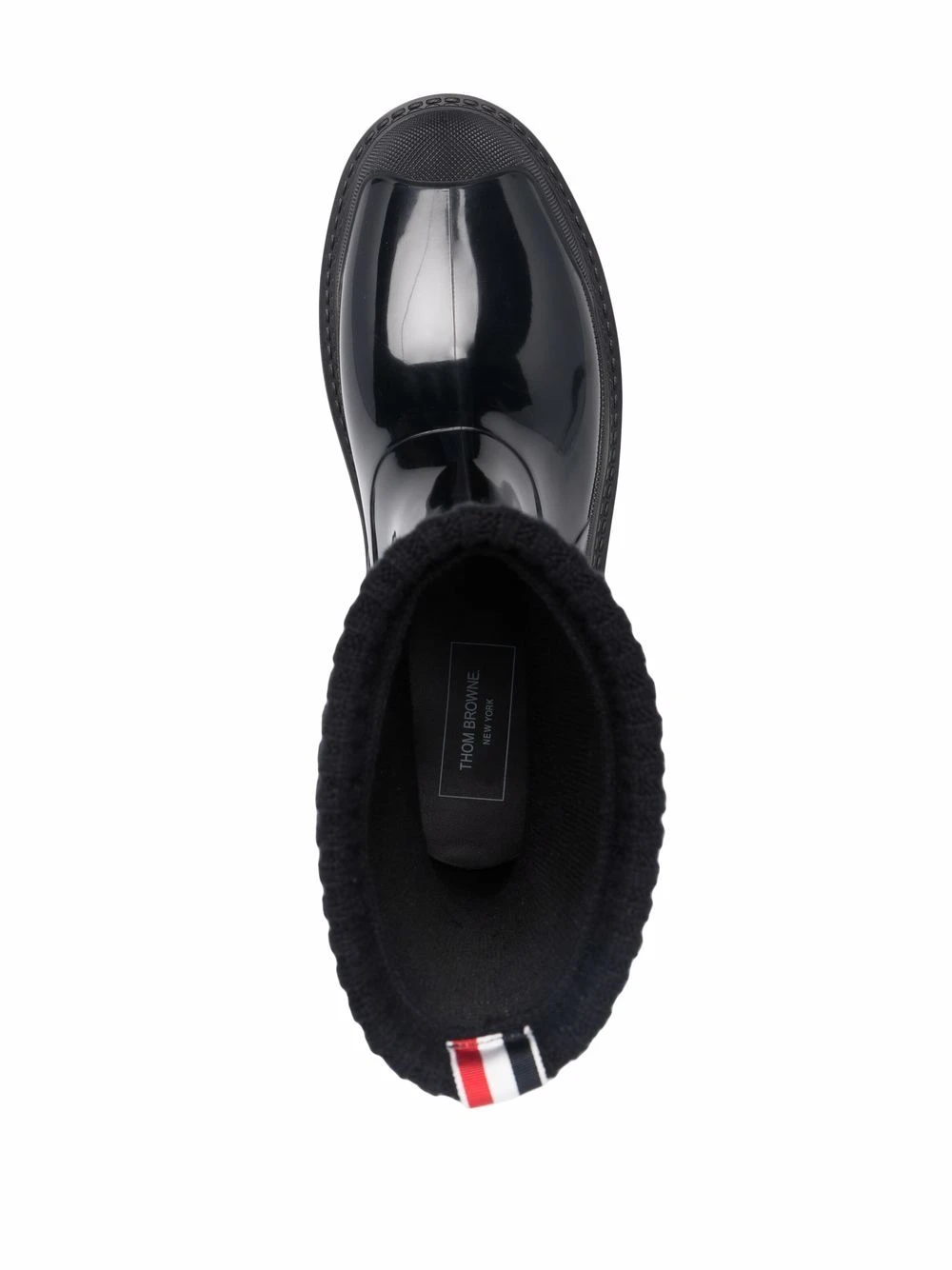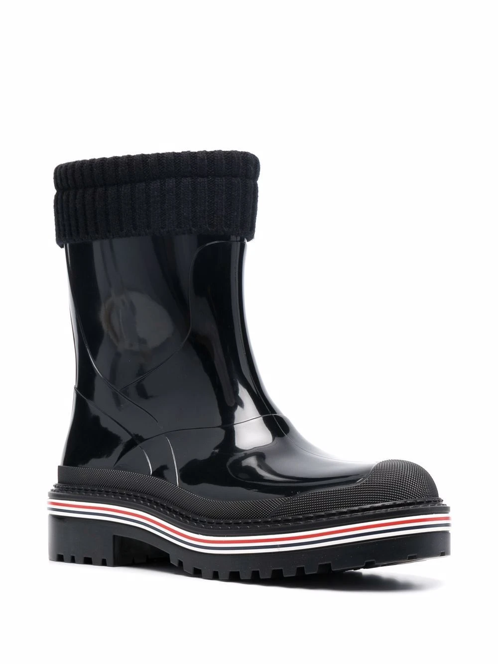 Noir, fini brillant, bout rond, rayures bleu, blanc et rouge, bordures nervurées, semelle intérieure à logo, à enfiler, semelle crantée en caoutchouc.