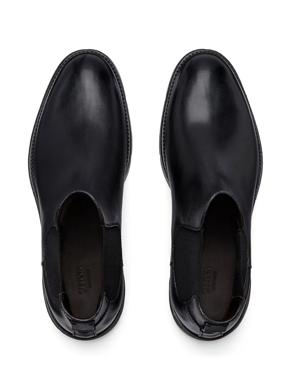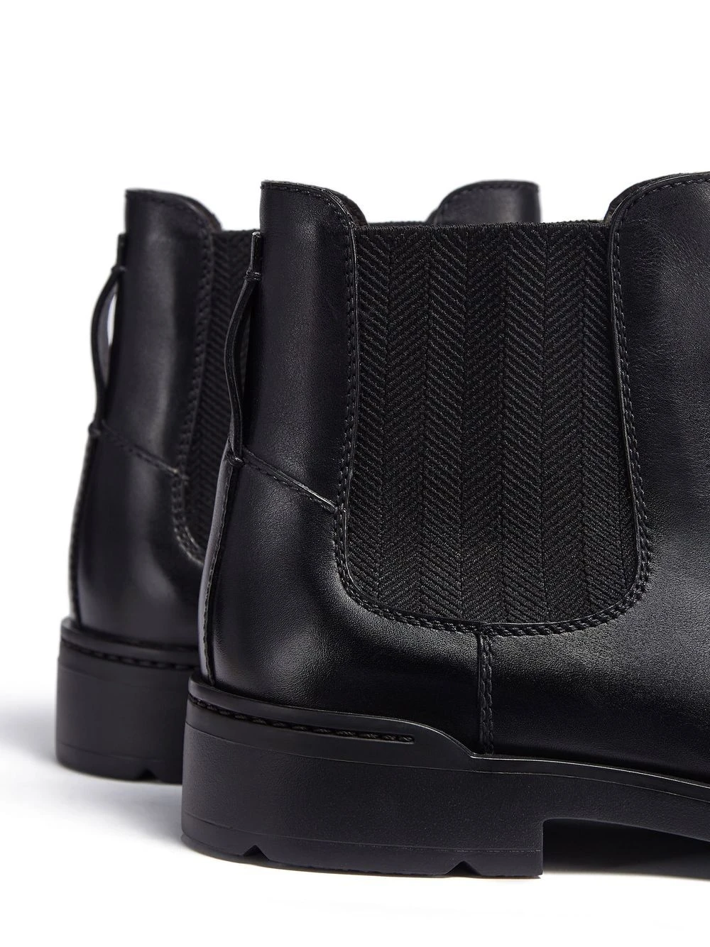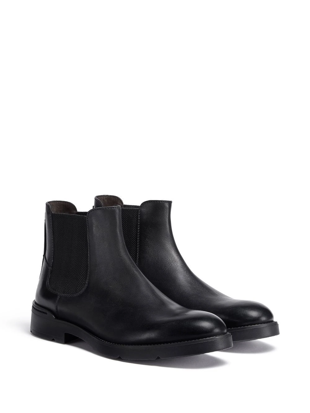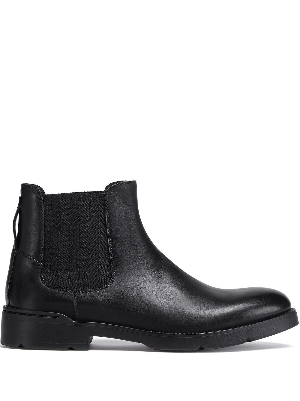Noir, cuir, empiècements élastiqués sur les côtés, bout rond, design à enfiler, semelle en caoutchouc.