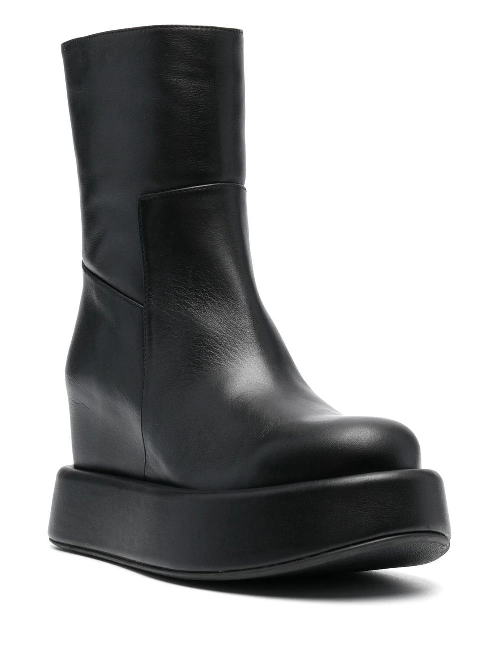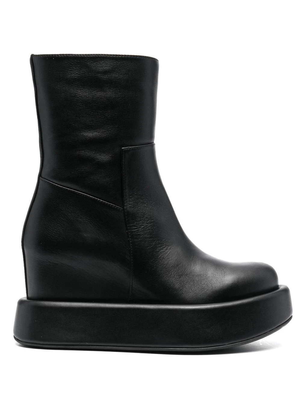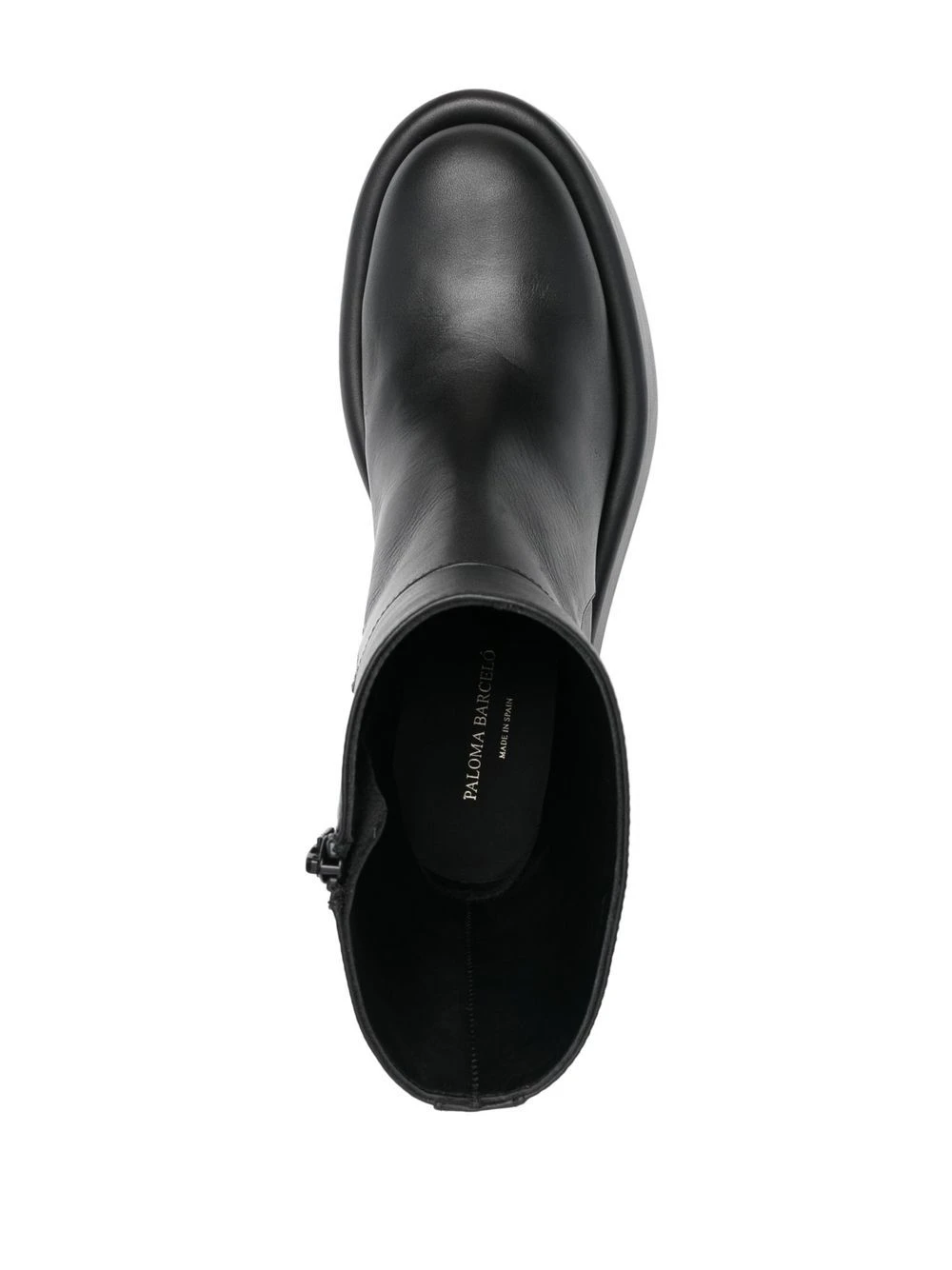 Noir de jais, cuir de veau, fermeture zippée sur le côté, bout rond, semelle épaisse en caoutchouc, semelle plate.