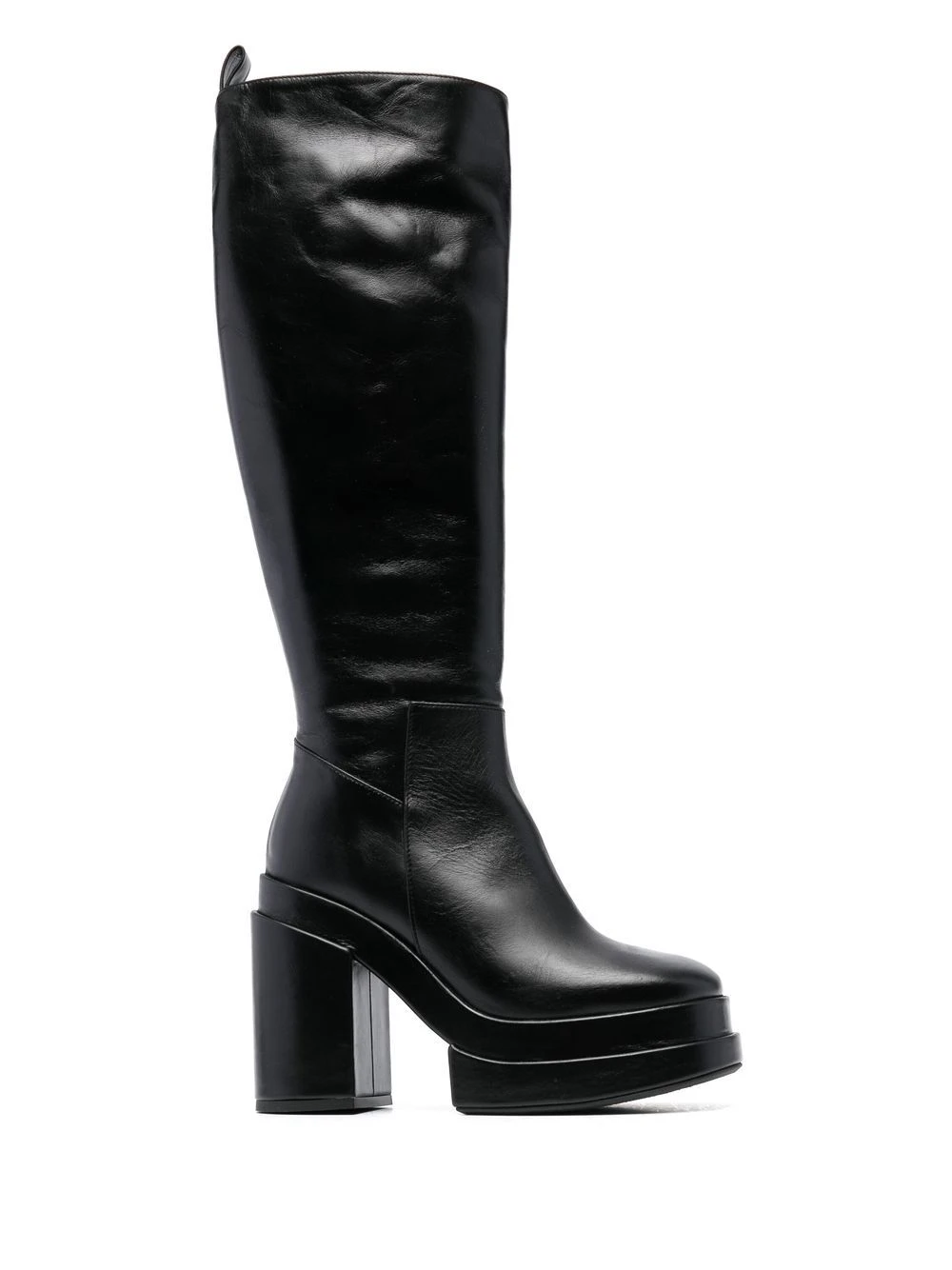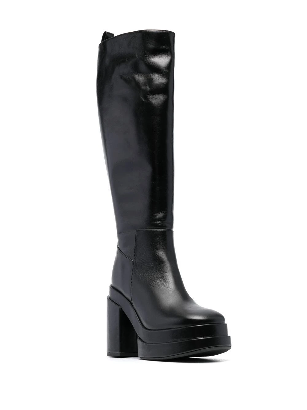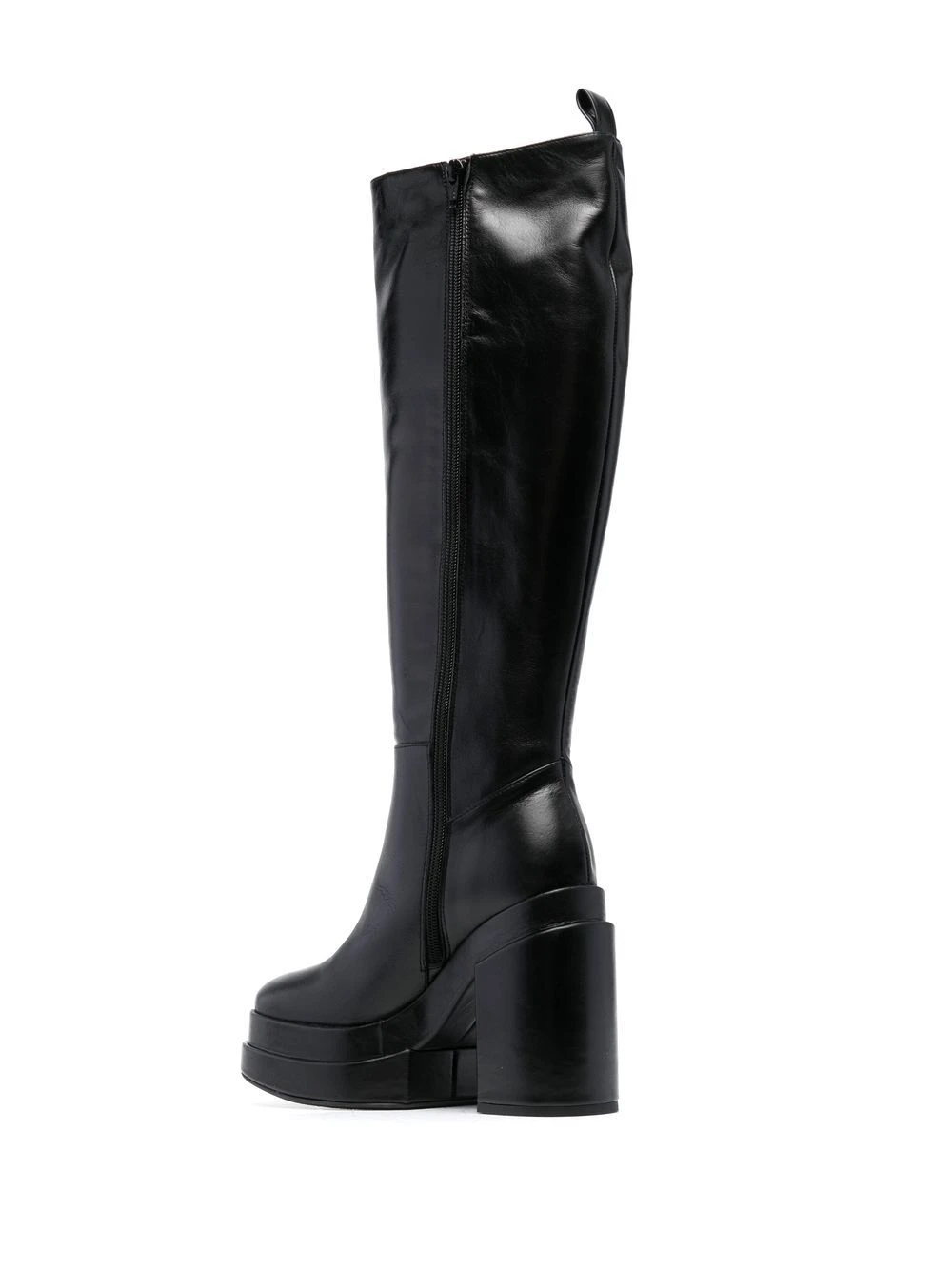 Noir, cuir de veau, fermeture zippée sur le côté, bout carré, hauteur genou, semelle à plateforme, talon haut épais.
