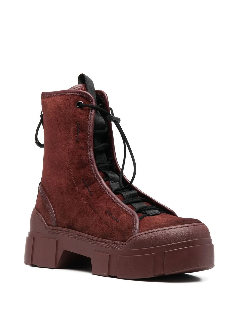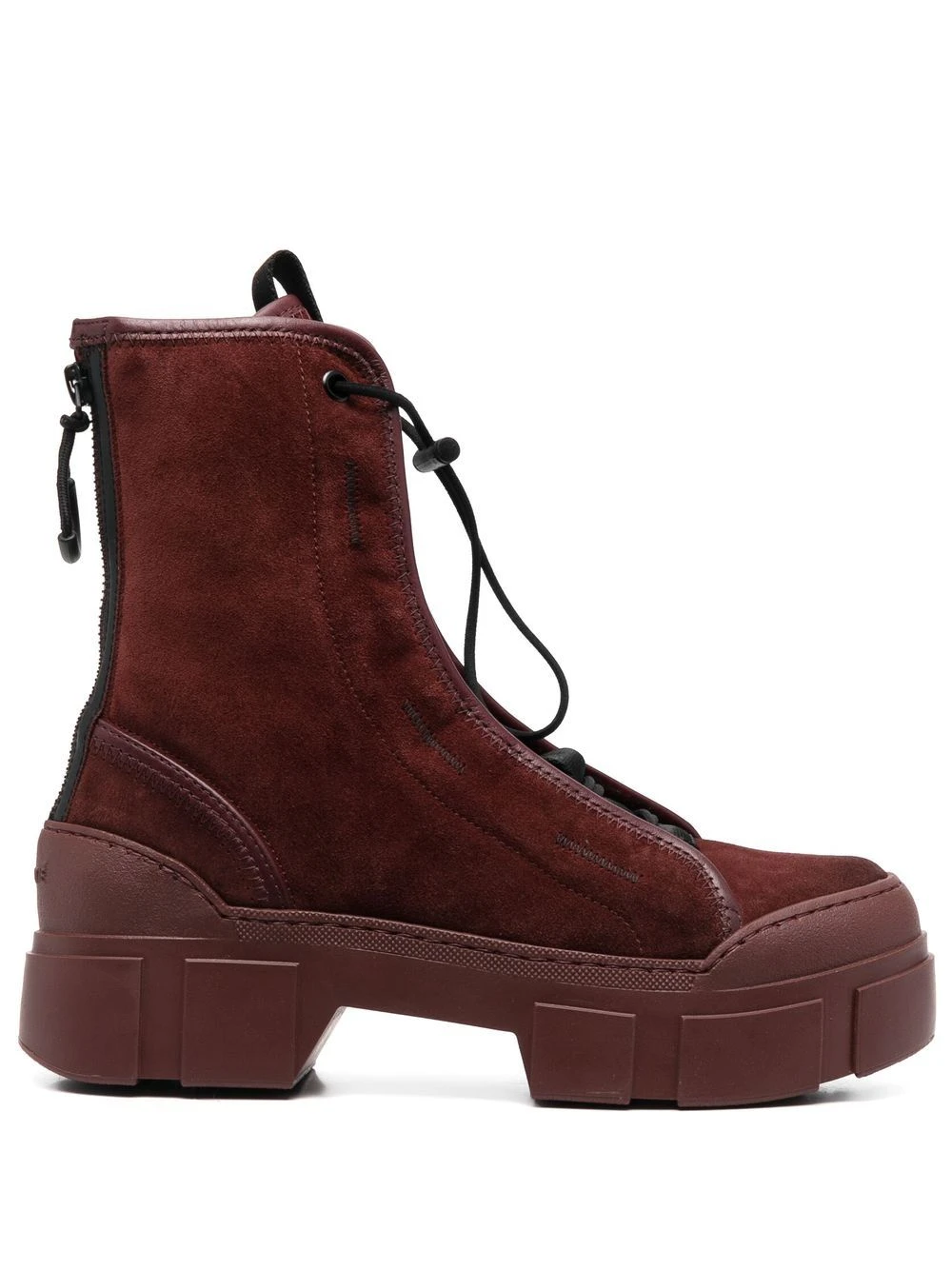 Bordeaux, cuir de veau, fermeture à lacer sur le devant, bout rond, fermeture zippée à l’arrière, petit talon.