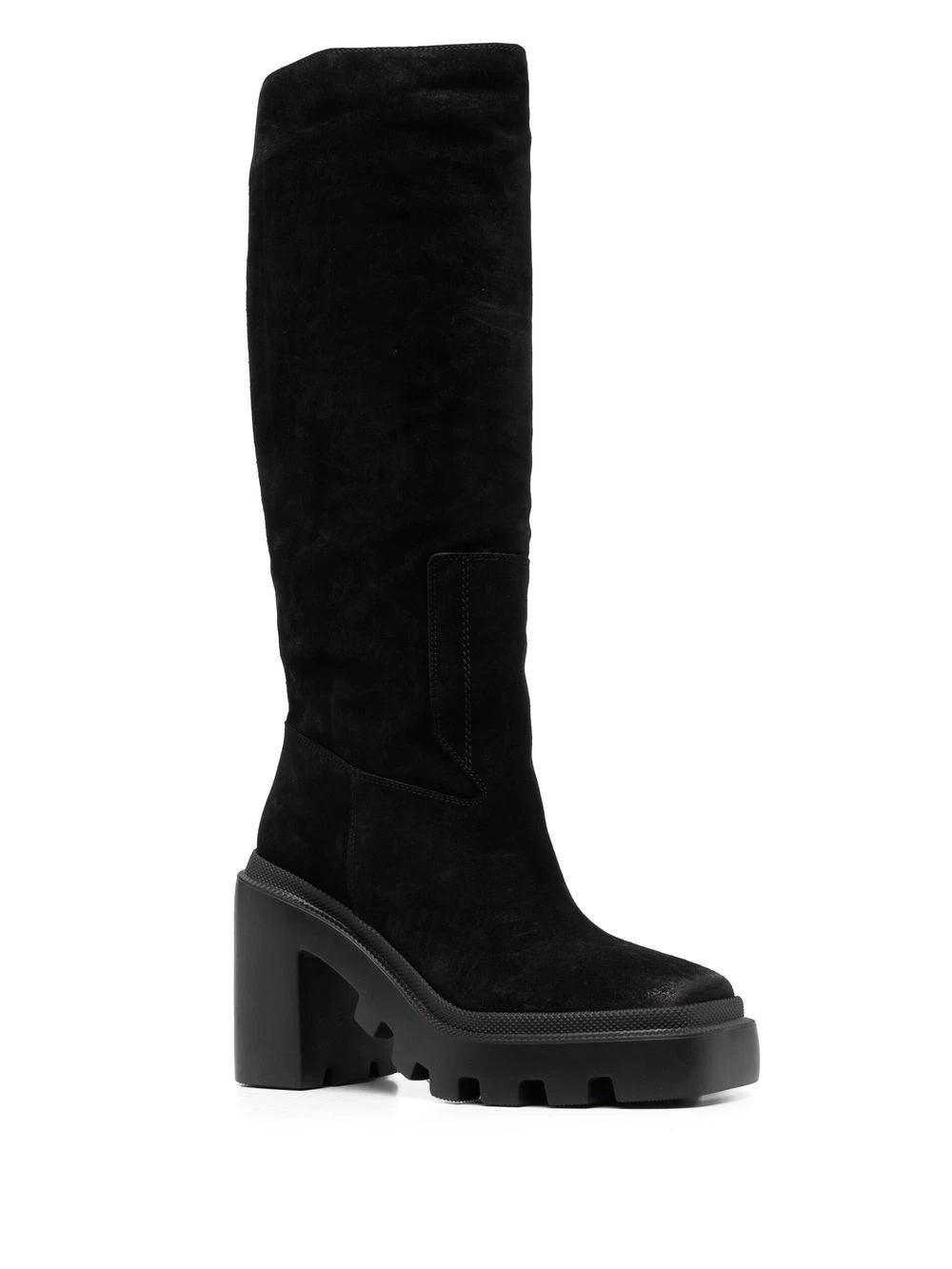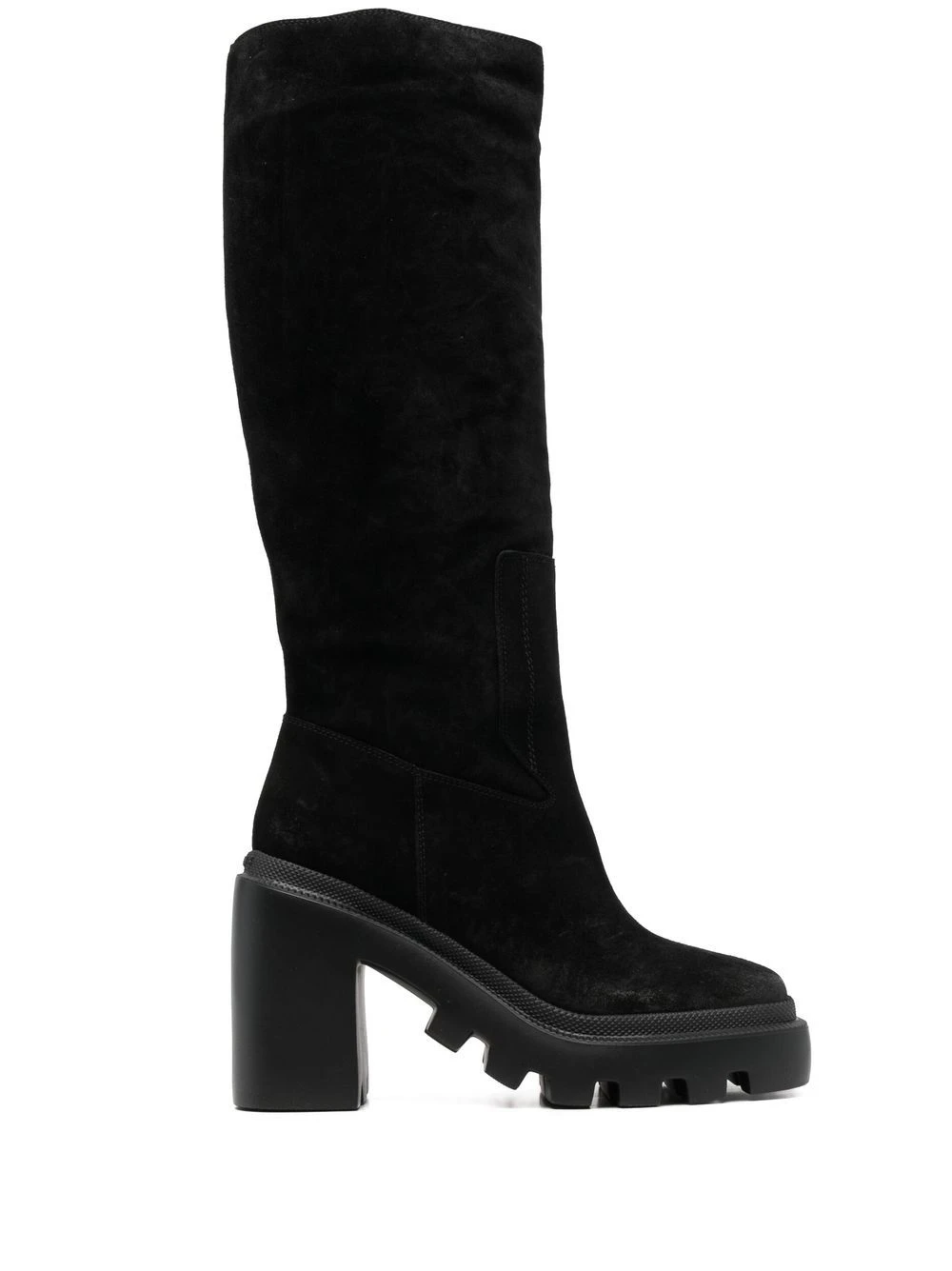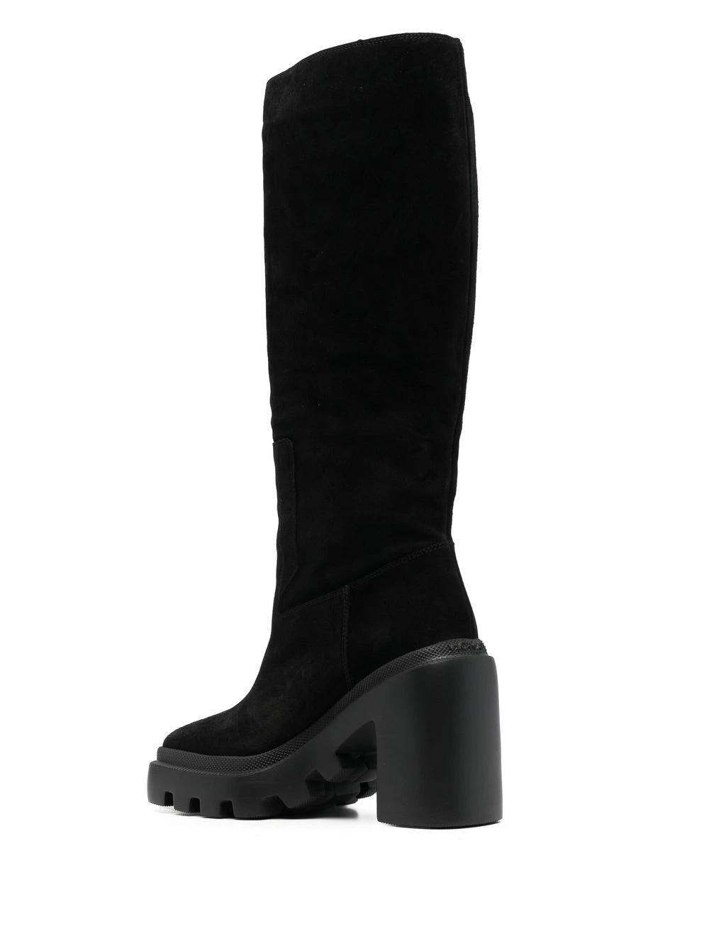 Noir, cuir de veau, bout carré, bout rond, talon mi-haut épais, semelle crantée en caoutchouc.